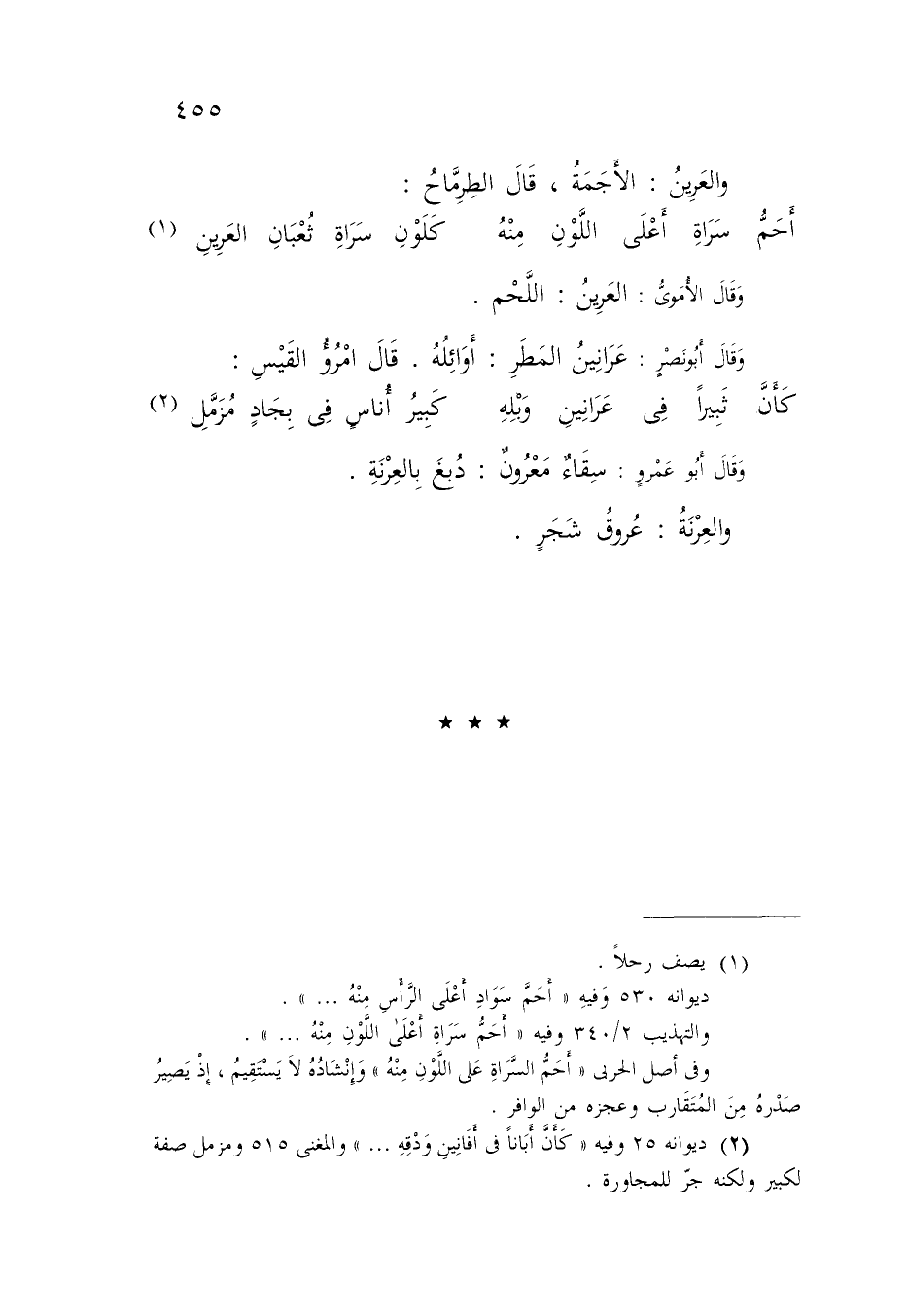 وَقَالَ الْأُمَوِيُّ: الْعَرِينُ اللَّحْمُ وَقَالَ أَبُو نَصْرٍ: عَرَانِينُ الْمَطَرِ: أَوَائِلُهُ , قَالَ امْرُؤُ الْقَيْسِ: