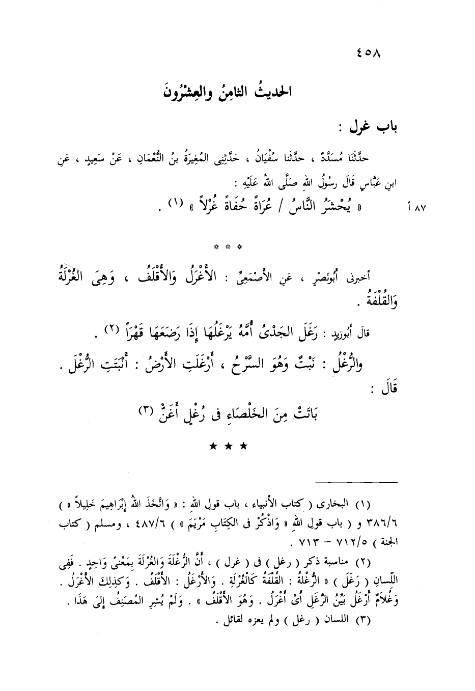 حَدَّثَنَا مُسَدَّدٌ , حَدَّثَنَا سُفْيَانُ , حَدَّثَنِي الْمُغِيرَةُ بْنُ النُّعْمَانِ , عَنْ سَعِيدٍ , عَنِ ابْنِ عَبَّاسٍ , قَالَ رَسُولُ اللَّهِ صَلَّى اللَّهُ عَلَيْهِ: «يُحْشَرُ النَّاسُ عُرَاةً §حُفَاةً غُرْلًا» أَخْبَرَنِي أَبُو نَصْرٍ , عَنِ الْأَصْمَعِيُّ: الْأَغْرَلُ وَالْأَقْلَفُ , وَهِيَ الْغُرْلَةُ وَالْقُلْفَةُ قَالَ أَبُو زَيْدٍ: رَغَلَ الْجَدْيُ أُمَّهُ يَرْغَلُهَا إِذَا رَضِعَهَا قَهْرًا وَالرُّغْلُ: نَبْتٌ وَهُوَ السَّرْحُ , أَرْغَلَتِ الْأَرْضُ: أَنْبَتَتِ الرُّغْلَ , قَالَ: بَاتَتْ مِنَ الْخُلَصَاءِ فِي رُغْلٍ أَغَنَّ