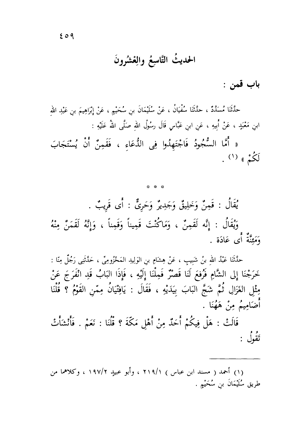 حَدَّثَنَا مُسَدَّدٌ , حَدَّثَنَا سُفْيَانُ , عَنْ سُلَيْمَانَ بْنِ سُحَيْمٍ , عَنْ إِبْرَاهِيمَ بْنِ عَبْدِ اللَّهِ بْنِ مَعْبَدٍ , عَنْ أَبِيهِ , عَنِ ابْنِ عَبَّاسٍ , قَالَ رَسُولُ اللَّهِ صَلَّى اللَّهُ عَلَيْهِ: «§أَمَّا السُّجُودُ فَاجْتَهِدُوا فِي الدُّعَاءِ , فَقَمِنٌ أَنْ يُسْتَجَابَ لَكُمْ» يُقَالُ: قَمِنٌ , وَخَلِيقٌ , وَجَدِيرٌ , وَحَرِيٌّ: أَيْ قَرِيبٌ وَيُقَالُ: إِنَّهُ لَقَمِنٌ , وَمَا كُنْتُ قَمِينًا وَقَمِنًا , وَإِنَّهُ لَقَمَنٌ مِنْهُ , وَمِئَنَّةٌ أَيْ عَادَةٌ