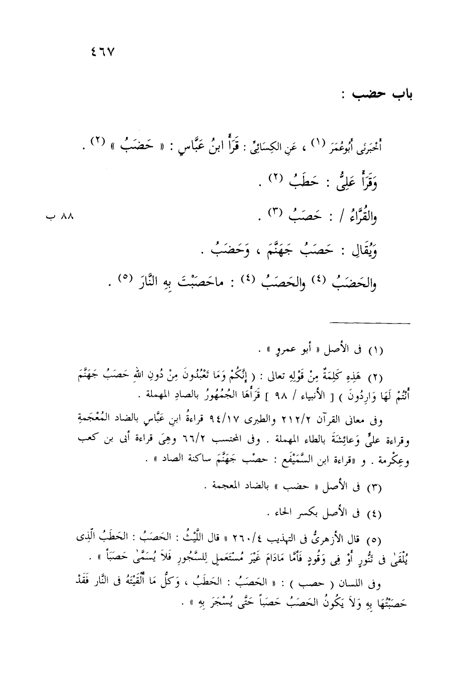 §بَابُ: حضب أَخْبَرَنِي أَبُو عُمَرَ , عَنِ الْكِسَائِيِّ: قَرَأَ ابْنُ عَبَّاسٍ: حَضَبُ وَقَرَأَ عَلِيٌّ: «حَطَبُ» وَالْقُرَّاءُ: «حَصَبُ» وَيُقَالُ: حَصَبُ جَهَنَّمَ , وَحَضَبُ وَالْحَضَبُ وَالْحَصَبُ: مَا حصَبْتَ بِهِ النَّارُ -[468]- أَخْبَرَنَا سَلَمَةُ , عَنِ الْفَرَّاءِ: الْحَضَبُ: كُلُّ مَا هَيَّجْتَ بِهِ النَّارَ , وَأَوْقَدْتَهَا بِهِ فَهُوَ حَضَبٌ