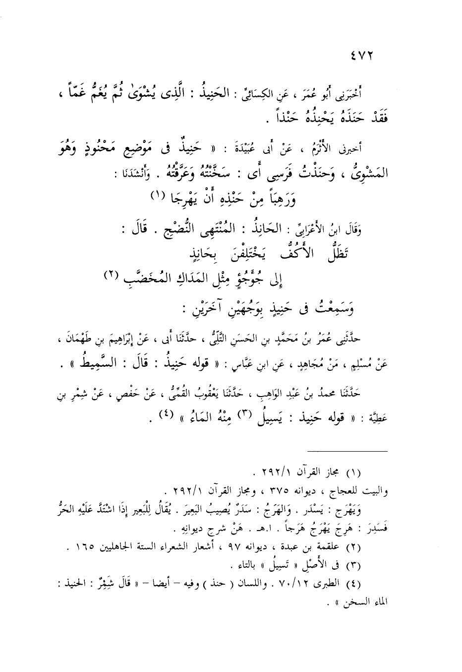 حَدَّثَنَا مُحَمَّدُ بْنُ عَبْدِ الْوَاهِبِ , حَدَّثَنَا يَعْقُوبُ الْقُمِّيُّ , عَنْ حَفْصٍ , عَنْ شِمْرِ بْنِ عَطِيَّةَ: " §قَوْلَهُ {حَنِيذٍ} [هود: 69] يَسِيلُ مِنْهُ الْمَاءُ " -[473]- وَقَالَ الْفَرَّاءُ: حَنَذْتُ الْفَرَسَ أَحْنِذُهُ إِذَا أَحْمَاهُ بِالْجَرْيِ لِيَعْرَقَ , فَإِنْ لَمْ يَعْرَقْ قِيلَ: كَبَا وَالْقُرُونُ: سُرْعَةُ الْعَرَقِ وَالنَّضِيحُ: الْعَرَقُ , وَالرَّشْحُ: مِثْلُهُ وَالِاسْتِحْمَامُ: الْعَرَقُ وَالْمَسِيحُ: الْعَرَقُ