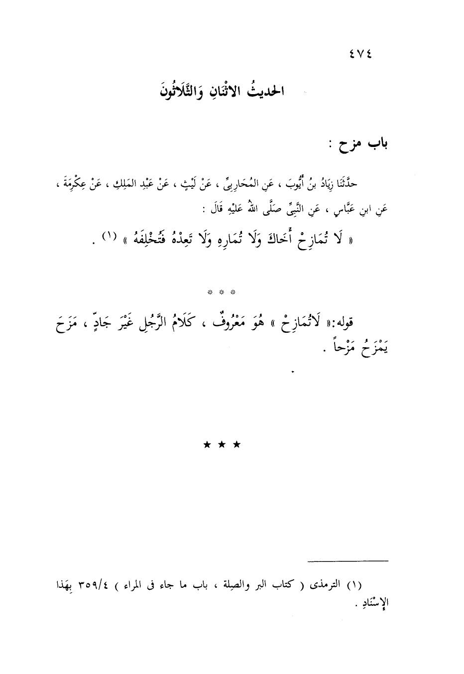 حَدَّثَنَا زِيَادُ بْنُ أَيُّوبَ , عَنِ الْمُحَارِبِيِّ , عَنْ لَيْثٍ , عَنْ عَبْدِ الْمَلِكِ , عَنْ عِكْرِمَةَ , عَنِ ابْنِ عَبَّاسٍ , عَنِ النَّبِيِّ صَلَّى اللَّهُ عَلَيْهِ قَالَ: «§لَا تُمَازِحْ أَخَاكَ وَلَا تُمَارِهِ وَلَا تَعِدْهُ فَتُخْلِفَهُ» قَوْلُهُ: «لَا تُمَازِحْ» هُوَ مَعْرُوفٌ , كَلَامُ الرَّجُلِ غَيْرَ جَادٍّ , مَزَحَ يَمْزَحُ مَزْحًا