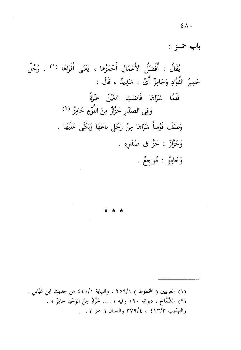 §بَابُ: حمز يُقَالُ: أَفْضَلُ الْأَعْمَالِ أَحْمَزُهَا , يَعْنِي أَقْوَاهَا , رَجُلٌ حَمِيزُ الْفُؤَادِ وَحَامِزٌ أَيْ شَدِيدٌ , قَالَ: