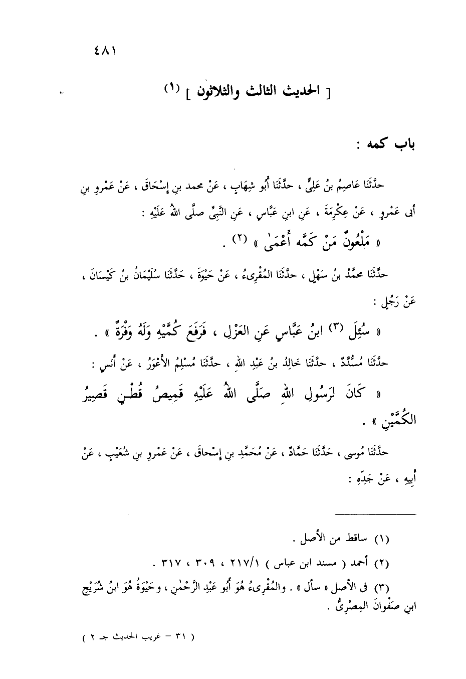 حَدَّثَنَا عَاصِمُ بْنُ عَلِيٍّ , حَدَّثَنَا أَبُو شِهَابٍ , عَنْ مُحَمَّدِ بْنِ إِسْحَاقَ , عَنْ عَمْرِو بْنِ أَبِي عَمْرٍو , عَنْ عِكْرِمَةَ , عَنِ ابْنِ عَبَّاسٍ , عَنِ النَّبِيِّ صَلَّى اللَّهُ عَلَيْهِ: «§مَلْعُونٌ مَنْ كَمَّهَ أَعْمَى»