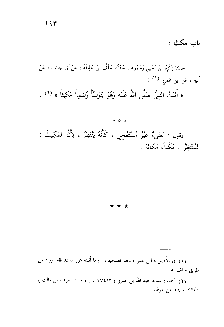 حَدَّثَنَا زَكَرِيَّا بْنُ يَحْيَى زَحْمَوَيْهِ , حَدَّثَنَا خَلَفُ بْنُ خَلِيفَةَ , عَنْ أَبِي جَنَابٍ , عَنْ أَبِيهِ , عَنِ ابْنِ عَمْرٍو: أَتَيْتُ النَّبِيَّ صَلَّى اللَّهُ عَلَيْهِ وَهُوَ §يَتَوَضَّأُ وُضُوءًا مَكِيثًا يَقُولُ: بَطِيءٌ غَيْرُ مُسْتَعْجِلٍ , كَأَنَّهُ يَنْتَظِرُ؛ لِأَنَّ الْمَكِيثَ: الْمُنْتَظِرُ , مَكَثَ مَكَانَهُ