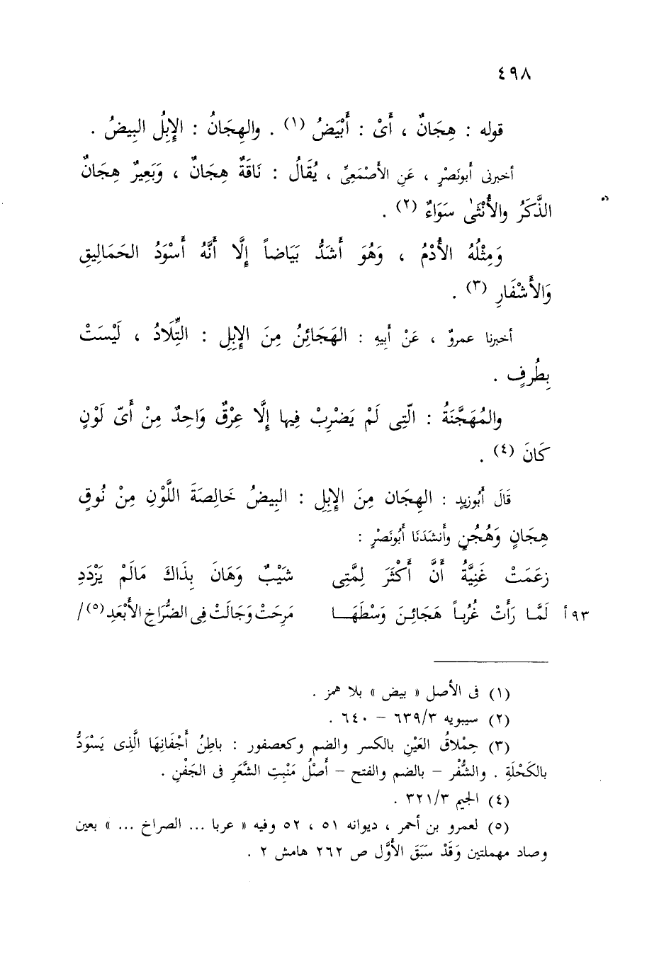 قَوْلُهُ: هِجَانٌ , أَيْ: أَبْيَضُ , وَالْهِجَانُ: الْإِبِلُ الْبِيضُ أَخْبَرَنِي أَبُو نَصْرٍ , عَنِ الْأَصْمَعِيِّ يُقَالُ: نَاقَةٌ هِجَانٌ , وَبَعِيرٌ هِجَانٌ الذَّكَرُ وَالْأُنْثَى سَوَاءٌ وَمِثْلُهُ الْأُدْمُ , وَهُوَ أَشَدُّ بَيَاضًا إِلَّا أَنَّهُ أَسْوَدُ الْحَمَالِيقِ وَالْأَشْفَارِ أَخْبَرَنَا عَمْرٌو عَنْ أَبِيهِ: الْهَجَائِنُ مِنَ الْإِبِلِ: التِّلَادُ , لَيْسَتْ بِطُرُفٍ وَالْمُهَجَّنَةُ: الَّتِي لَمْ يَضْرِبْ فِيهَا إِلَّا عِرْقٌ وَاحِدٌ مِنْ أَيْ لَوْنٍ كَانَ قَالَ أَبُو زَيْدٍ: الْهِجَانُ مِنَ الْإِبِلِ: الْبِيضُ خَالِصَةُ اللَّوْنِ مِنْ نُوقٍ هِجَانٍ , وَهُجُنٍ وَأَنْشَدَنَا أَبُو نَصْرٍ:
