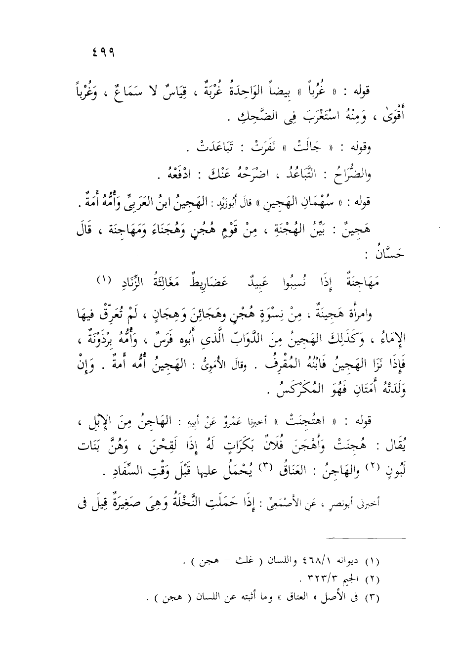 قَوْلُهُ: «غُرُبًا» بِيضًا , الْوَاحِدَةُ غُرْبَةٌ , قِيَاسٌ لَا سَمَاعٌ , وَغُرْبًا أَقْوَى , وَمِنْهُ اسْتَغْرَبَ فِي الضَّحِكِ وَقَوْلُهُ: جَالَتْ , نَفَرَتْ: تَبَاعَدَتْ وَالضُّرَاحُ: التَّبَاعُدُ , اضْرَحْهُ عَنْكَ: ادْفَعْهُ قَوْلُهُ: سُهْمَانِ الْهَجِينِ قَالَ أَبُو زَيْدٍ: الْهَجِينُ ابْنُ الْعَرَبِيِّ وَأُمُّهُ أَمَةٌ هَجِينٌ: بَيِّنُ الْهُجْنَةِ , مِنْ قَوْمٍ هُجُنٍ وَهُجَنَاءَ وَمَهَاجَنَةٍ قَالَ: حَسَّانُ:
