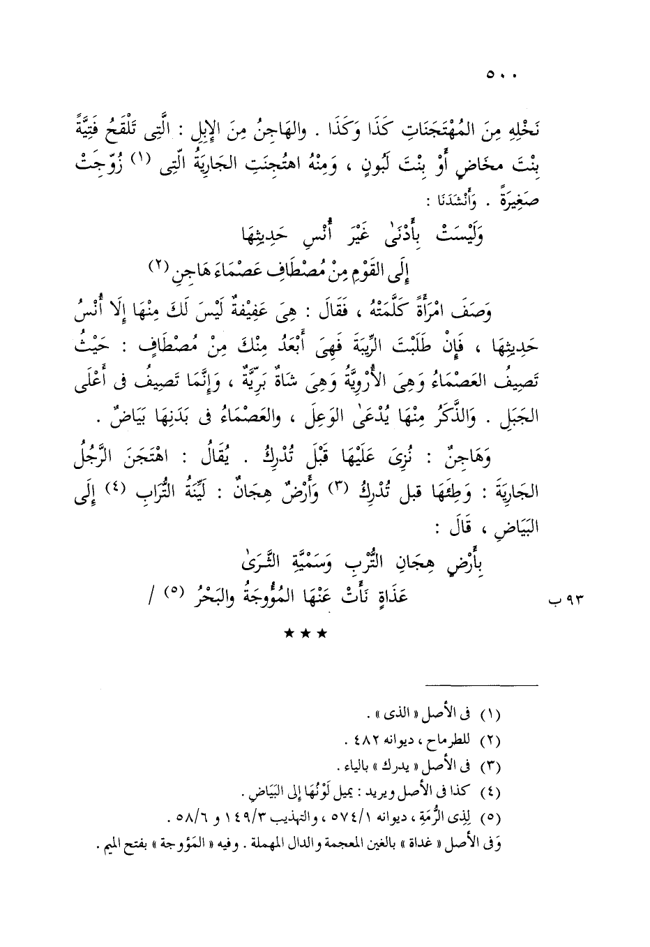 وَصَفَ امْرَأَةً كَلَّمَتْهُ , فَقَالَ: هِيَ عَفِيفَةٌ لَيْسَ لَكَ مِنْهَا إِلَّا أُنْسُ حَدِيثِهَا , فَإِنْ طَلَبْتَ الرِّيبَةَ فَهِيَ أَبْعَدُ مِنْكَ مِنْ مُصْطَافٍ: حَيْثُ تَصِيفُ الْعَصْمَاءُ وَهِيَ الْأُرْوِيَّةُ وَهِيَ شَاةٌ بَرِيَّةٌ , وَإِنَّمَا تَصِيفُ فِي أَعْلَى الْجَبَلِ , وَالذَّكَرُ مِنْهَا يُدْعَى الْوَعْلُ , وَالْعَصْمَاءُ فِي بَدَنِهَا بَيَاضٌ وَهَاجِنٌ: نُزِيَ عَلَيْهَا قَبْلَ أَنْ تُدْرِكَ يُقَالُ: اهْتَجَنَ الرَّجُلُ الْجَارِيَةَ: وَطِئَهَا قَبْلَ أَنْ تُدْرِكُ , وَأَرْضٌ هِجَانٌ: لَيِّنَةُ التُّرَابِ إِلَى الْبَيَاضِ قَالَ: