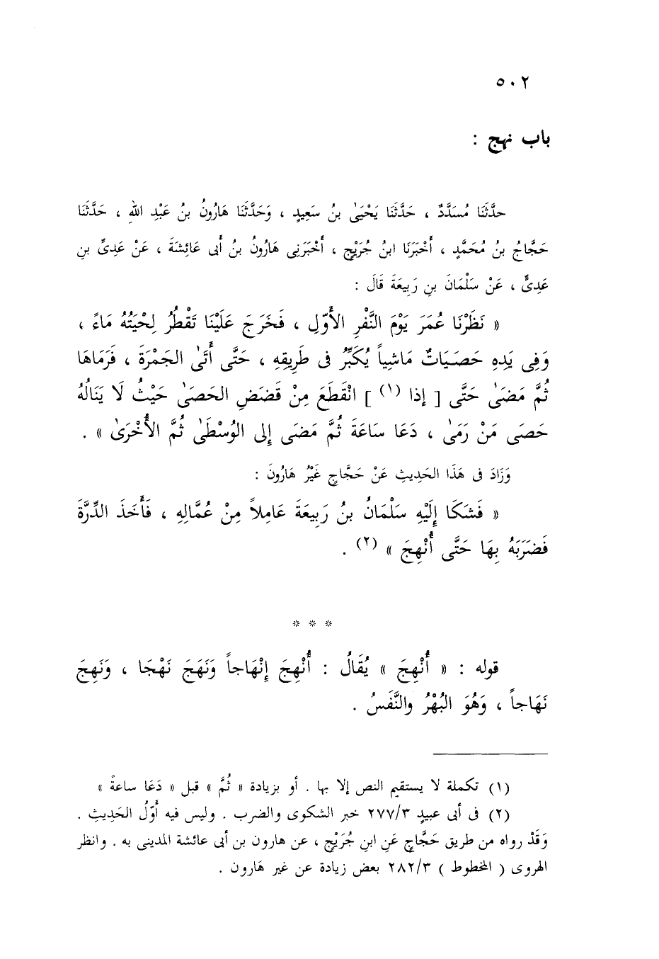 حَدَّثَنَا مُسَدَّدٌ , حَدَّثَنَا يَحْيَى بْنُ سَعِيدٍ , وَحَدَّثَنَا هَارُونُ بْنُ عَبْدِ اللَّهِ , حَدَّثَنَا حَجَّاجُ بْنُ مُحَمَّدٍ , أَخْبَرَنَا ابْنُ جُرَيْجٍ , أَخْبَرَنِي هَارُونُ بْنُ أَبِي عَائِشَةَ , عَنْ عَدِيِّ بْنِ عَدِيٍّ , عَنْ سَلْمَانَ بْنِ رَبِيعَةَ , قَالَ: نَظَرْنَا عُمَرَ يَوْمَ النَّفْرِ الْأَوَّلِ , §فَخَرَجَ عَلَيْنَا تَقْطُرُ لِحْيَتُهُ مَاءً , وَفِي يَدِهِ حَصَيَاتٌ , مَاشِيًا يُكَبِّرُ فِي طَرِيقِهِ , حَتَّى أَتَى الْجَمْرَةَ , فَرَمَاهَا , ثُمَّ مَضَى حَتَّى إِذَا انْقَطَعَ مِنْ قَضَضِ الْحَصَى - حَيْثُ لَا يَنَالُهُ حَصَى مَنْ رَمَى - دَعَا سَاعَةً , ثُمَّ مَضَى إِلَى الْوُسْطَى , ثُمَّ الْأُخْرَى وَزَادَ فِي هَذَا الْحَدِيثِ عَنْ حَجَّاجٍ غَيْرُ هَارُونَ: فَشَكَا إِلَيْهِ سَلْمَانُ بْنُ رَبِيعَةَ عَامِلًا مِنْ عُمَّالِهِ , فَأَخَذَ الدِّرَّةَ , فَضَرَبَهُ بِهَا حَتَّى أُنْهِجَ قَوْلُهُ: «أُنْهِجَ» يُقَالُ: أُنْهِجَ إِنْهَاجًا , وَنَهَجَ نَهْجًا , وَنَهِجَ نِهَاجًا , وَهُوَ الْبُهْرُ وَالنَّفَسُ -[503]- أَخْبَرَنِي أَبُو نَصْرٍ , عَنِ الْأَصْمَعِيِّ: النَّهْجُ: الطَّرِيقُ الْوَاضِحُ الْبَيِّنُ , وَأُنْهِجَ الثَّوْبُ: أَخْلَقَ , وَنَهِجَ , وَأَنْهَجَهُ الْبِلَى , وَأَنْشَدَنَا: