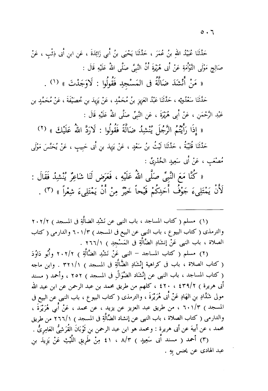 حَدَّثَنَا عُبَيْدُ اللَّهِ بْنُ عُمَرَ , حَدَّثَنَا يَحْيَى بْنُ أَبِي زَائِدَةَ , عَنِ ابْنِ أَبِي ذِئْبٍ , عَنْ صَالِحٍ , مَوْلَى التَّوْأَمَةِ , عَنْ أَبِي هُرَيْرَةَ , أَنَّ النَّبِيَّ صَلَّى اللَّهُ عَلَيْهِ قَالَ: " §مَنْ أَنْشَدَ ضَالَّةً فِي الْمَسْجِدِ فَقُولُوا: لَا وَجَدْتَ "