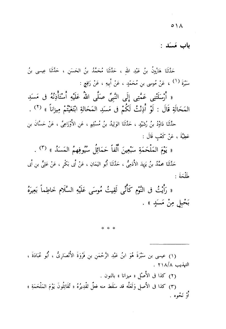 حَدَّثَنَا هَارُونُ بْنُ عَبْدِ اللَّهِ , حَدَّثَنَا مُحَمَّدُ بْنُ الْحَسَنِ , حَدَّثَنَا عِيسَى بْنُ سَبْرَةَ , عَنْ مُوسَى بْنِ مُحَمَّدٍ , عَنْ أَبِيهِ , عَنْ رَافِعٍ , أَرْسَلَتْنِي عَمَّتِي إِلَى النَّبِيِّ صَلَّى اللَّهُ عَلَيْهِ أَسْتَأْذِنُهُ فِي مَسَدِ الْمَحَالَةِ قَالَ: «§لَوْ أَذِنْتُ لَكُمْ فِي مَسَدِ الْمَحَالَةِ ابْتَغَيْتُمْ مِيزَانًا»