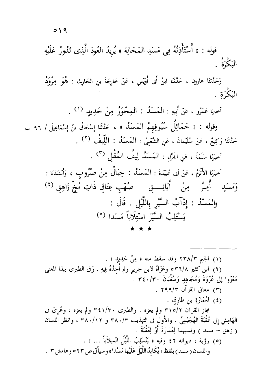 قَوْلُهُ: «أَسْتَأْذِنُهُ فِي مَسَدِ الْمَحَالَةِ» يُرِيدُ الْعُودَ الَّذِي تَدُورُ عَلَيْهِ الْبَكْرَةُ وَحَدَّثَنَا هَارُونُ , حَدَّثَنَا ابْنُ أَبِي أُوَيْسٍ , عَنْ خَارِجَةَ بْنِ الْحَارِثِ: هُوَ مِرْوَدُ الْبَكْرَةِ أَخْبَرَنَا عَمْرٌو , عَنْ أَبِيهِ: الْمَسَدُ: الْمِحْوَرُ مِنْ حَدِيدٍ وَقَوْلُهُ: «حَمَائِلُ سُيُوفِهِمُ الْمَسَدُ» حَدَّثَنَا إِسْحَاقُ بْنُ إِسْمَاعِيلَ , حَدَّثَنَا وَكِيعٌ , عَنْ سُلَيْمَانَ , عَنِ الشَّعْبِيِّ: الْمَسَدُ: اللِّيفُ. أَخْبَرَنَا سَلَمَةُ , عَنِ الْفَرَّاءِ: الْمَسَدُ لِيفُ الْمُقْلِ. أَخْبَرَنَا الْأَثْرَمُ , عَنْ أَبِي عُبَيْدَةَ: الْمَسَدُ: حِبَالٌ مِنْ ضُرُوبٍ , وَأَنْشَدَنَا: