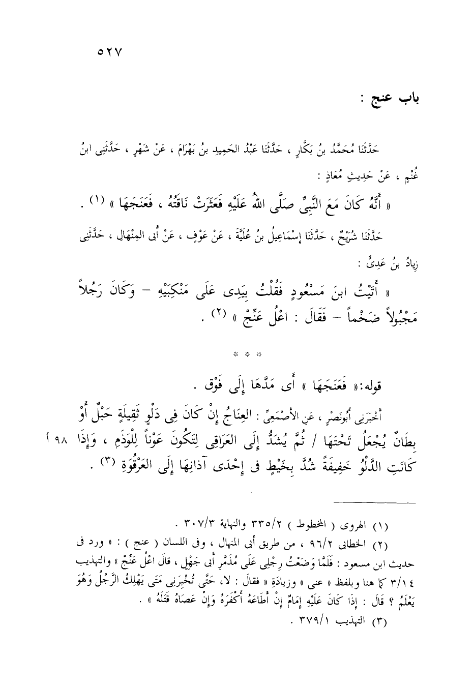 حَدَّثَنَا شُرَيْحٌ , حَدَّثَنَا إِسْمَاعِيلُ بْنُ عُلَيَّةَ , عَنْ عَوْفٍ , عَنْ أَبِي الْمِنْهَالِ , حَدَّثَنِي زِيَادُ بْنُ عَدِيٍّ: " أَتَيْتُ ابْنَ مَسْعُودٍ فَقُلْتُ بِيَدِي عَلَى مَنْكِبَيْهِ - وَكَانَ رَجُلًا مَجْبُولًا ضَخْمًا - فَقَالَ: «§اعْلُ عَنِّجْ» قَوْلُهُ: «فَعَنَجَهَا» أَيْ مَدَّهَا إِلَى فَوْقٍ أَخْبَرَنِي أَبُو نَصْرٍ , عَنِ الْأَصْمَعِيِّ: الْعِنَاجُ إِنْ كَانَ فِي دَلْوٍ ثَقِيلَةٍ حَبْلٌ أَوْ بِطَانٌ يُجْعَلُ تَحْتَهَا ثُمَّ يُشَدُّ إِلَى الْعَرَاقِي لِتَكُونَ عَوْنًا لِلْوَذَمِ , وَإِذَا كَانَتِ الدَّلْوُ خَفِيفَةً شُدَّ بِخَيْطٍ فِي إِحْدَى آذَانِهَا إِلَى -[528]- وَقَالَ أَبُو زَيْدٍ: عَنَجَ الرَّجُلُ بَعِيرَهُ يَعْنِجُهُ عَنْجًا إِذَا جَذَبَ خِطَامَهُ مِنْ قِبَلِ رَأْسِهِ , وَهُوَ رَاكِبٌ عَلَيْهِ حَتَّى رُبَّمَا لَزَقَ ذِفْرَاهُ بِقَادِمِ الرَّحْلِ قَالَ الشَّاعِرُ فِي عِنَاجِ الدَّلْوِ: