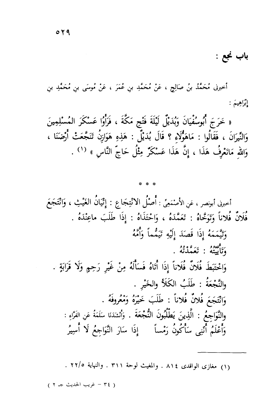 أَخْبَرَنِي مُحَمَّدُ بْنُ صَالِحٍ , عَنْ مُحَمَّدِ بْنِ عُمَرَ , عَنْ مُوسَى بْنِ مُحَمَّدِ بْنِ إِبْرَاهِيمَ: " خَرَجَ أَبُو سُفْيَانَ وَبُدَيْلُ لَيْلَةَ فَتْحِ مَكَّةَ , فَرَأَوْا عَسْكَرَ الْمُسْلِمِينَ وَالنِّيرَانَ , فَقَالُوا: مَا هَؤُلَاءِ؟ قَالَ بُدَيْلُ: هَذِهِ هَوَازِنُ §تَنَجَّعَتْ أَرْضَنَا , وَاللَّهِ مَا نَعْرِفُ هَذَا إِنَّ هَذَا عَسْكَرٌ مِثْلُ حَاجِ النَّاسِ " أَخْبَرَنِي أَبُو نَصْرٍ , عَنِ الْأَصْمَعِيِّ: " أَصْلُ الِانْتِجَاعِ: إِتْيَانُ الْغَيْثِ , وَانْتَجَعَ فُلَانٌ فُلَانًا وَتَوَخَّاهُ: تَعَمَّدَهُ , وَاحْتَذَاهُ: إِذَا طَلَبَ مَا عِنْدَهُ وَتَيَمَّمَهُ إِذَا قَصَدَ إِلَيْهِ تَيَمُّمًا وَأَمَّهُ وَتَأَيَّيْتُهُ: تَعَمَّدْتُهُ وَاخْتَبَطَ فُلَانٌ فُلَانًا إِذَا أَتَاهُ فَسَأَلَهُ مِنْ غَيْرِ رَحِمٍ وَلَا قَرَابَةٍ وَالنَّجْعَةُ: طَلَبُ الْكَلَأِ وَالْخَيْرِ وَانْتَجَعَ فُلَانٌ فُلَانًا: طَلَبَ خَيْرَهُ وَمَعْرُوفَهُ وَالنَّوَاجِعُ: الَّذِينَ يَطْلُبُونَ النَّجْعَةَ وَأَنْشَدَنَا سَلَمَةُ عَنِ الْفَرَّاءِ: