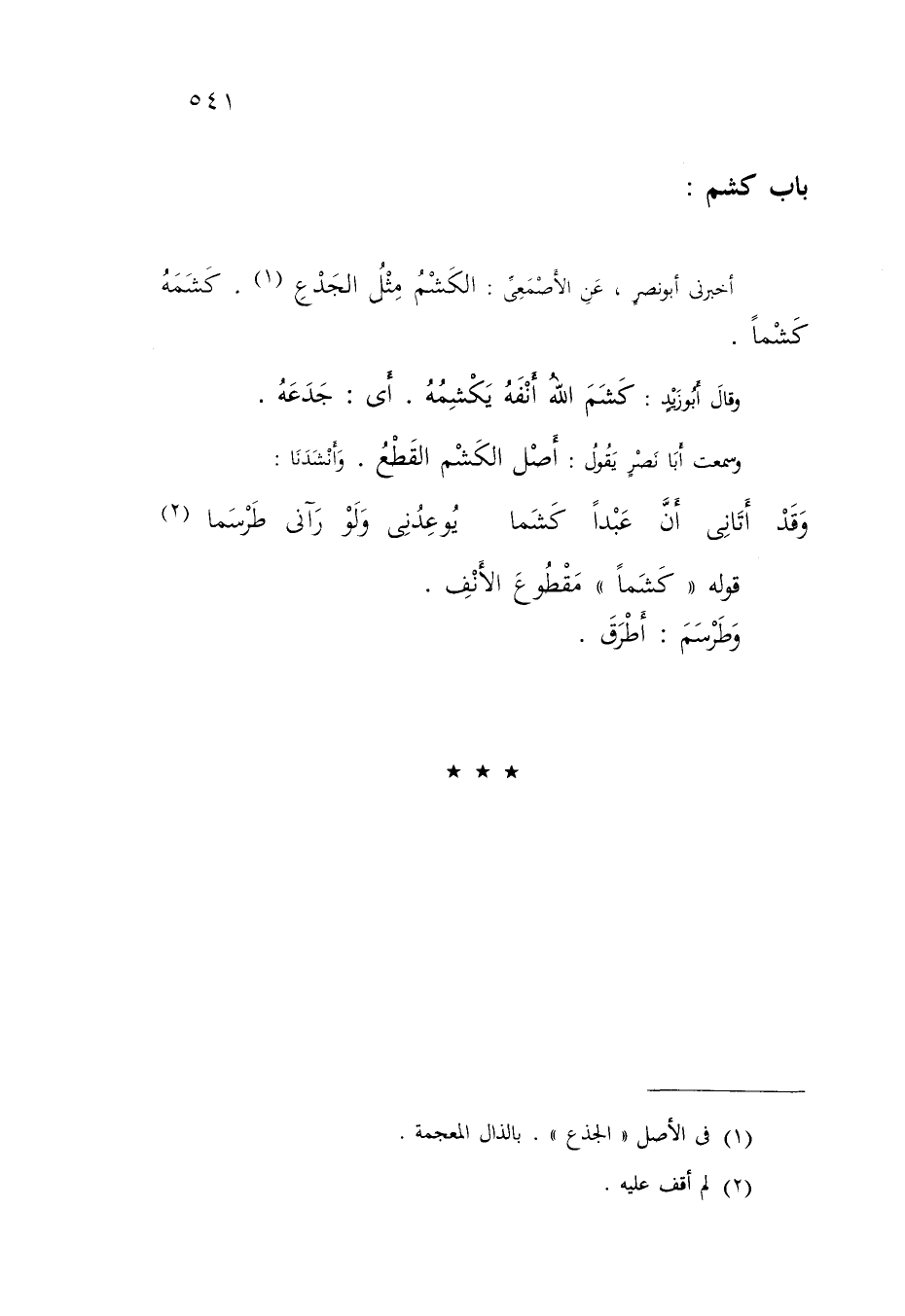 أَخْبَرَنِي أَبُو نَصْرٍ , عَنِ الْأَصْمَعِيِّ: «§الْكَشْمُ مِثْلُ الْجَدْعِ كَشَمَهُ كَشْمًا» وَقَالَ أَبُو زَيْدٍ: كَشَمَ اللَّهُ أَنْفَهُ يَكْشِمُهُ أَيْ: جَدَعَهُ وَسَمِعْتُ أَبَا نَصْرٍ يَقُولُ: أَصْلُ الْكَشْمِ الْقَطْعُ وَأَنْشَدَنَا: