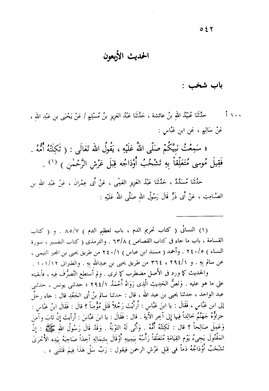 حَدَّثَنَا عُبَيْدُ اللَّهِ بْنُ عَائِشَةَ , حَدَّثَنَا عَبْدُ الْعَزِيزِ بْنُ مُسْلِمٍ , عَنْ يَحْيَى بْنِ عَبْدِ اللَّهِ , عَنْ سَالِمٍ , عَنِ ابْنِ عَبَّاسٍ: «سَمِعْتُ نَبِيَّكُمْ , صَلَّى اللَّهُ عَلَيْهِ ,» يَقُولُ اللَّهُ تَعَالَى: §ثَكِلَتْهُ أُمُّهُ فَقِيلَ مُوسَى مُتَعَلِّقًا بِهِ تَشْخُبُ أَوْدَاجُهُ قِبَلَ عَرْشِ الرَّحْمَنِ "