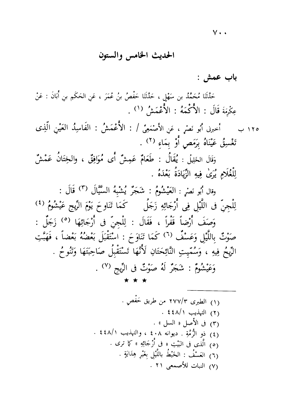 حَدَّثَنَا مُحَمَّدُ بْنُ سَهْلٍ , حَدَّثَنَا حَفْصُ بْنُ عُمَرَ , عَنِ الْحَكَمِ بْنِ أَبَانَ: عَنْ عِكْرِمَةَ قَالَ: {§الْأَكْمَهُ} [آل عمران: 49] : «الْأَعْمَشُ» أَخْبَرَنِي أَبُو نَصْرٍ , عَنِ الْأَصْمَعِيِّ: الْأَعْمَشُ: الْفَاسِدُ الْعَيْنِ الَّذِي تَغْسِقُ عَيْنَاهُ بِرَمَصٍ أَوْ بِمَاءٍ وَقَالَ الْخَلِيلُ: يُقَالُ: طَعَامٌ عَمِشٌ , أَيْ مُوَافِقٌ , وَالْخِتَانُ عَمْشٌ لِلْغُلَامِ يُرَى فِيهِ الزِّيَادَةُ بَعْدَهُ وَقَالَ أَبُو نَصْرٍ: الْعَيْشُومُ: شَجَرٌ يُشْبِهُ السَّيَّالَ , قَالَ: