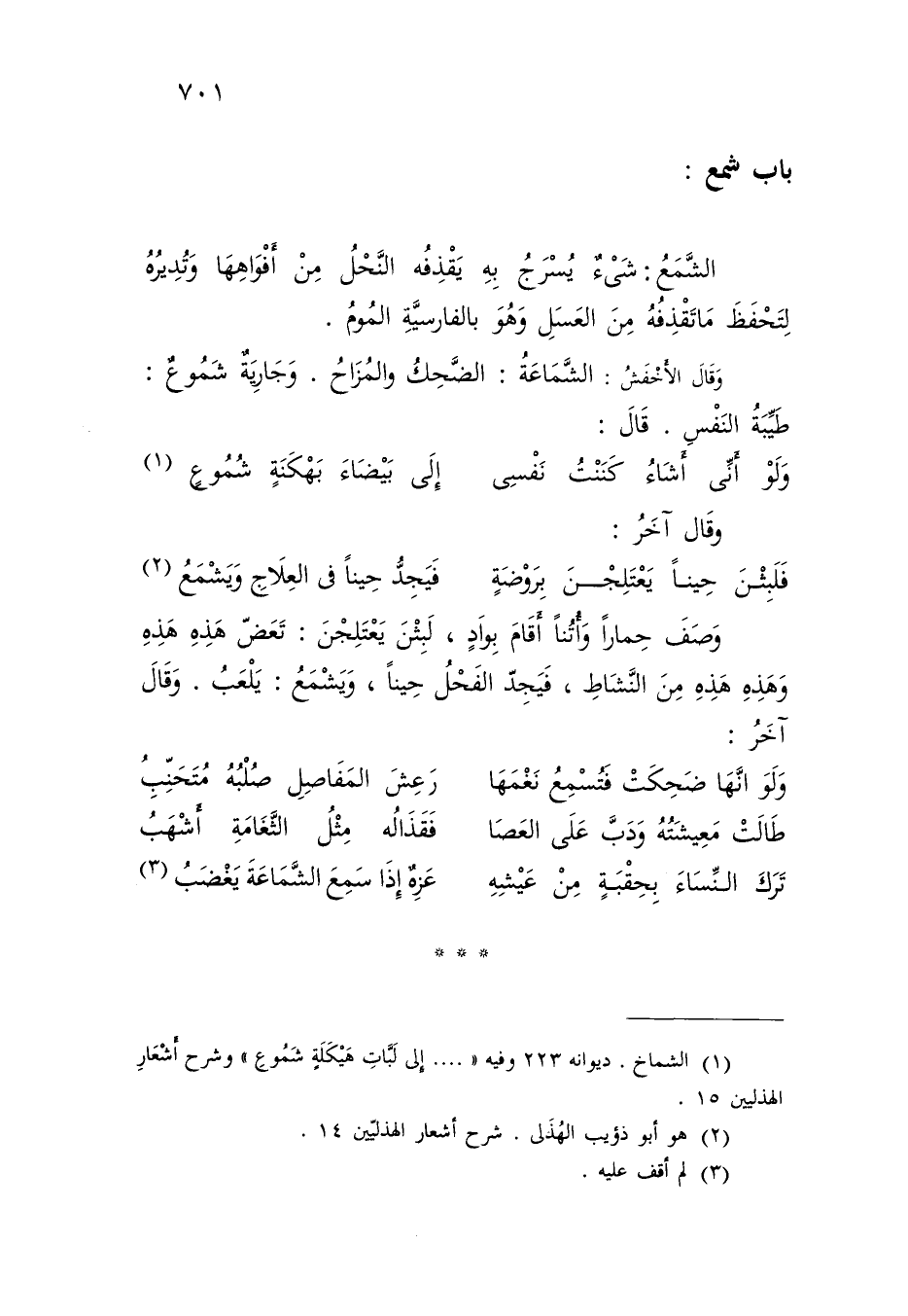 §بَابُ: شمع الشَّمَعُ: شَيْءٌ يُسْرَجُ بِهِ , يَقْذِفُهُ النَّحْلُ مِنْ أَفْوَاهِهَا , وَتُدِيرُهُ لِتَحْفَظَ مَا تَقْذِفُهُ مِنَ الْعَسَلِ , وَهُوَ بِالْفَارِسِيَّةِ: (الموم) وَقَالَ الْأَخْفَشُ: الشَّمَاعَةُ: الضَّحِكُ وَالْمُزَاحُ , وَجَارِيَةٌ شَمُوعٌ: طَيِّبَةُ النَّفْسِ , قَالَ: