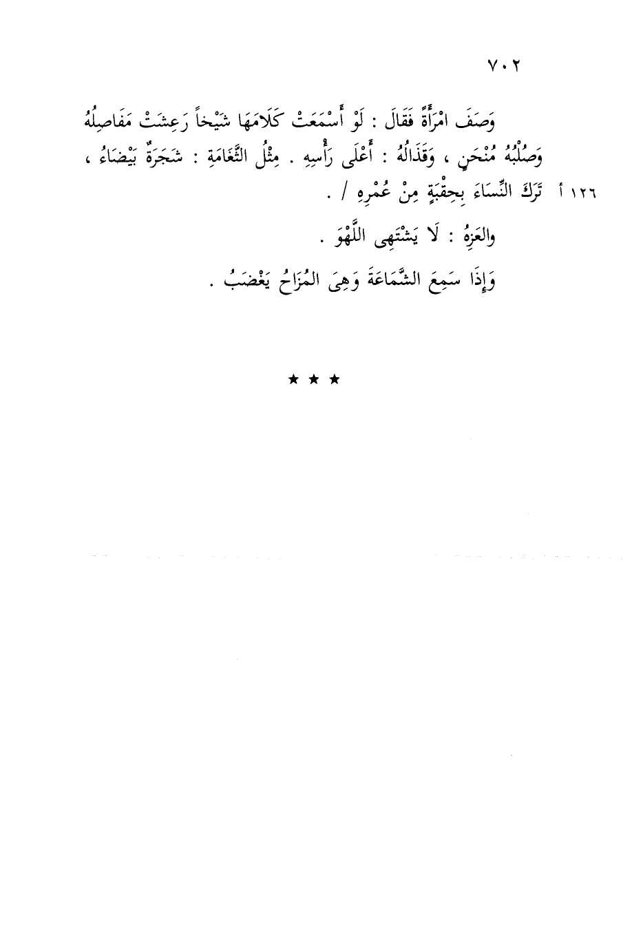 وَصَفَ امْرَأَةً فَقَالَ: لَوْ أَسَمَعَتْ كَلَامَهَا شَيْخًا رَعِشَتْ مَفَاصِلُهُ وَصُلْبُهُ مُنْحَنٍ وَقَذَالُهُ: أَعْلَى رَأْسِهِ مِثْلُ الثَّغَامَةِ: شَجَرَةٌ بَيْضَاءُ , تَرَكَ النِّسَاءَ بِحِقْبَةٍ مِنْ عُمْرِهِ وَالْعَزِهُ: لَا يَشْتَهِي اللَّهْوَ وَإِذَا سَمِعَ الشَّمَاعَةَ وَهِيَ الْمُزَاحُ يَغْضَبُ