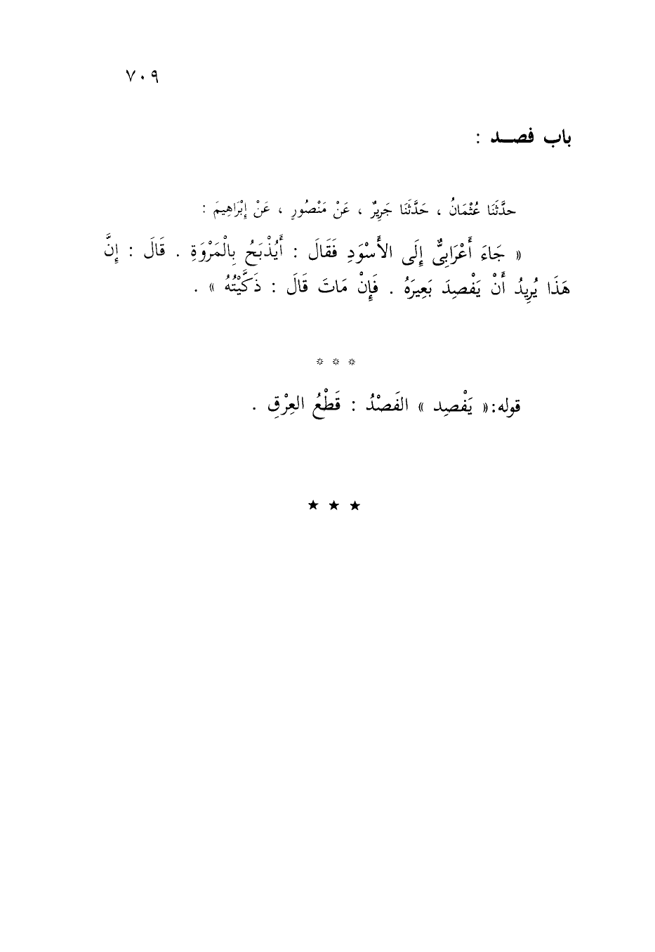 حَدَّثَنَا عُثْمَانُ , حَدَّثَنَا جَرِيرٌ , عَنْ مَنْصُورٍ , عَنْ إِبْرَاهِيمَ: جَاءَ أَعْرَابِيٌّ إِلَى الْأَسْوَدِ فَقَالَ: §أَيُذْبَحُ بِالْمَرْوَةِ؟ قَالَ: " إِنَّ هَذَا يُرِيدُ أَنْ يَفْصِدَ بَعِيرَهُ , فَإِنْ مَاتَ قَالَ: ذَكَّيْتُهُ " قَوْلُهُ: «يَفْصِدُ» , الْفَصْدُ: قَطْعُ الْعِرْقِ