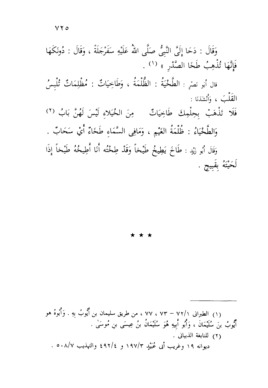 وَقَالَ: دَحَا إِلَيَّ النَّبِيُّ صَلَّى اللَّهُ عَلَيْهِ سَفَرْجَلَةً وَقَالَ: «دُونَكَهَا؛ فَإِنَّهَا §تُذْهِبُ طَخَا الصَّدْرِ» قَالَ أَبُو نَصْرٍ: الطَّخْيَةُ: الظُّلْمَةُ , وَطَاخِيَاتٌ: مُظْلِمَاتٌ تُلْبِسُ الْقَلْبَ وَأَنْشَدَنَا: