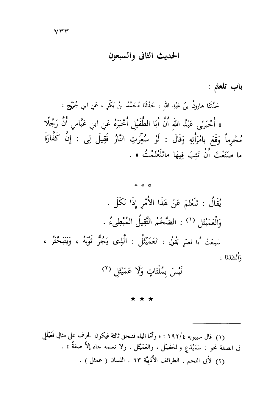 حَدَّثَنَا هَارُونُ بْنُ عَبْدِ اللَّهِ , حَدَّثَنَا مُحَمَّدُ بْنُ بَكْرٍ , عَنِ ابْنِ جُرَيْجٍ: أَخْبَرَنِي عَبْدُ اللَّهِ , أَنَّ أَبَا الطُّفَيْلِ , أَخْبَرَهُ عَنِ ابْنِ عَبَّاسٍ , " أَنَّ §رَجُلًا مُحْرِمًا وَقَعَ بِامْرَأَتِهِ , وَقَالَ: لَوْ سُعِّرَتِ النَّارُ , فَقِيلَ لِي: إِنَّ كَفَّارَةَ مَا صَنَعْتَ أَنْ تَثِبَ فِيهَا مَا تَلَعْثَمْتُ " يُقَالُ: تَلَعْثَمَ عَنْ هَذَا الْأَمْرِ إِذَا نَكَلَ وَالْعَمَيْثَلُ: الضَّخْمُ الثَّقِيلُ الْمُبْطِئُ سَمِعْتُ أَبَا نَصْرٍ يَقُولُ: الْعَمَيْثَلُ: الَّذِي يَجُرُّ ثَوْبَهُ وَيَتَبَخْتَرُ , وَأَنْشَدَنَا: