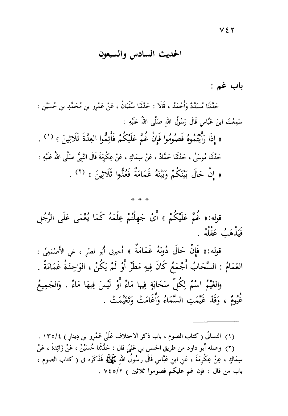 حَدَّثَنَا مُسَدَّدٌ , وَأَحْمَدُ , قَالَا: حَدَّثَنَا سُفْيَانُ , عَنْ عَمْرِو بْنِ مُحَمَّدِ بْنِ حُسَيْنٍ: سَمِعْتُ ابْنَ عَبَّاسٍ , قَالَ رَسُولُ اللَّهِ صَلَّى اللَّهُ عَلَيْهِ: «إِذَا رَأَيْتُمُوهُ فَصُومُوا , §فَإِنْ غُمَّ عَلَيْكُمْ فَأَتِمُّوا الْعِدَّةَ ثَلَاثِينَ»