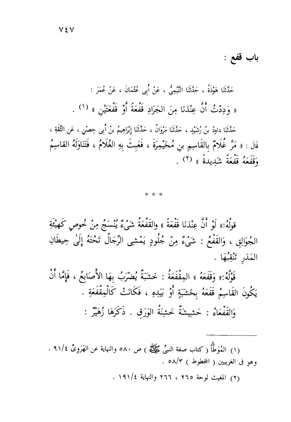 حَدَّثَنَا دَاوُدُ بْنُ رُشَيْدٍ , حَدَّثَنَا مَرْوَانُ , حَدَّثَنَا إِبْرَاهِيمُ بْنُ أَبِي حُصَيْنٍ , عَنِ الثِّقَةِ , قَالَ: «مَرَّ غُلَامٌ بِالْقَاسِمِ بْنِ مُخَيْمِرَةَ , فَعَبِثَ بِهِ الْغلَامُ , فَتَنَاوَلَهُ الْقَاسِمُ §وَقَفَعَهُ قَفْعَةً شَدِيدَةً» قَوْلُهُ: «لَوْ أَنَّ عِنْدَنَا قَفْعَةً» : وَالْقَفْعَةُ شَيْءٌ يُنْسَجُ مِنْ خُوصٍ كَهَيْئَةِ الْجَوَالِقِ , وَالْقَفْعُ: شَيْءٌ مِنْ جُلُودٍ يَمْشِي الرِّجَالُ تَحْتَهُ إِلَى حِيطَانِ الْمَدَرِ تَنْقِبُهَا قَوْلُهُ: «وَقَفَعَهُ» الْمِقْفَعَةُ: خَشَبَةٌ يُضْرَبُ بِهَا الْأَصَابِعُ , فَإِمَّا أَنْ يَكُونَ الْقَاسِمُ قَفَعَهُ بِخَشَبَةٍ أَوْ بِيَدِهِ , فَكَانَتْ كَالْمِقْفَعَةِ وَالْقَفْعَاءُ: حَشِيشَةٌ خَشِنَةُ الْوَرَقِ ذَكَرَهَا زُهَيْرٌ: