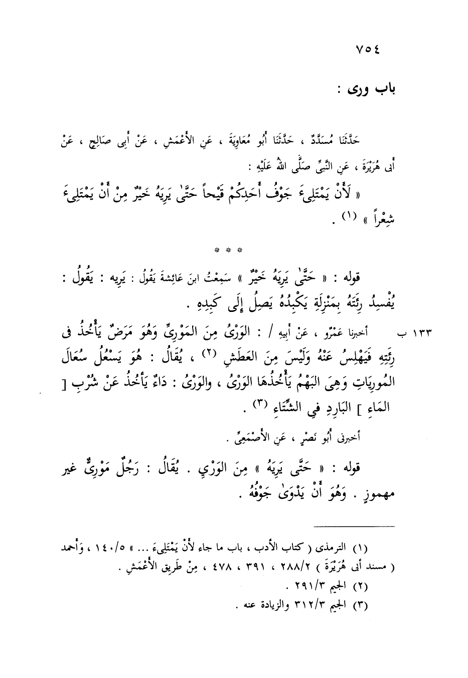 حَدَّثَنَا مُسَدَّدٌ , حَدَّثَنَا أَبُو مُعَاوِيَةَ , عَنِ الْأَعْمَشِ , عَنْ أَبِي صَالِحٍ , عَنْ أَبِي هُرَيْرَةَ , عَنِ النَّبِيِّ صَلَّى اللَّهُ عَلَيْهِ: «§لَأَنْ يَمْتَلِئَ جَوْفُ أَحَدِكُمْ قَيْحًا حَتَّى يُرِيَهُ خَيْرٌ مِنْ أَنِّ يَمْتَلِئَ شِعْرًا» قَوْلُهُ: «حَتَّى يُرِيَهُ خَيْرٌ» : سَمِعْتُ ابْنَ عَائِشَةَ يَقُولُ: يُرِيَهُ , يَقُولُ: يُفْسِدُ رِئَتَهُ , بِمَنْزِلَةِ يَكْبِدُهُ يَصِلُ إِلَى كَبِدِهِ أَخْبَرَنَا عَمْرٌو , عَنْ أَبِيهِ: الْوَرْيُ مِنَ الْمُورِيِّ , وَهُوَ مَرَضٌ يَأْخُذُ فِي رِئَتِهِ فَيَهْلِسُ عَنْهُ , وَلَيْسَ مِنَ الْعَطَشِ , يُقَالُ: هُوَ يَسْعُلُ سُعَالَ الْمُورِيَاتِ , وَهِيَ الْبَهْمُ يَأْخُذُهَا الْوَرْيُ , وَالْوَرْيُ: دَاءٌ يَأْخُذُ عَنْ شُرْبِ الْمَاءِ الْبَارِدِ فِي الشِّتَاءِ أَخْبَرَنِي أَبُو نَصْرٍ , عَنِ الْأَصْمَعِيِّ قَوْلُهُ: «حَتَّى يُرِيَهُ» مِنَ الْوَرْيِ , يُقَالُ: رَجُلٌ مَوْرِيٌّ غَيْرُ مَهْمُوزٍ وَهُوَ أَنْ يَدْوَى جَوْفُهُ -[755]- أَخْبَرَنَا عَمْرٌو , عَنْ أَبِيهِ , عَنِ الْوَالِبِيِّ: الْوَرْيُ مِنَ الْمُورِيِّ وَهُوَ مِنَ الْغيْظِ وَالْحَسَدِ وَالْعَطَشِ , يُقَالُ: وَارَاهُ الْغيْظُ وَالْحَسَدُ إِذَا أَدْوَاهُ وَقَدْ وَرِيَتِ الشَّاةُ , وَهُوَ أَنْ يَمْتَلِئَ قَصَبُ رِئَتِهَا قَيْحًا , وَإِنَّمَا يَكُونُ مِنَ الشَّرَقِ وَقَالَ ابْنُ الْأَعْرَابِيِّ: رَأَيْتُهُ مِنَ الرِّئَةِ , وَرَجَلْتُهُ مِنْ رِجْلِهِ , وَيَدَيْتُهُ مِنْ يَدِهِ , وَطَحَلْتُهُ وَعَضَدْتُهُ , وَرَأَسْتُهُ , وَفَأَدْتُهُ , وَكَبَدْتُهُ , وَأَنَفْتُهُ , أَصَبْتُ أَنْفَهُ , وَلَا يُقَالُ مِنَ الْجَسَدِ غَيْرُ هَذَا وَأَنْشَدَنَا أَبُو نَصْرٍ: