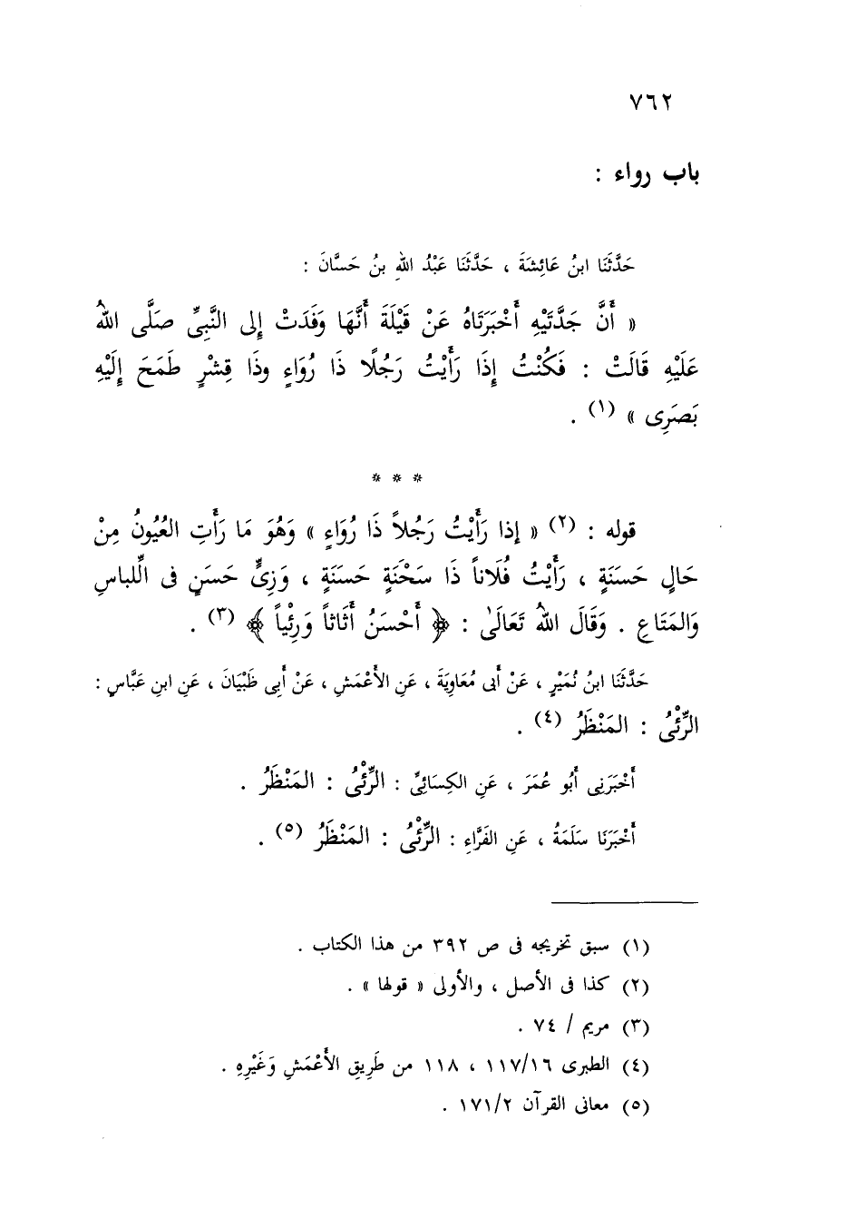 حَدَّثَنَا ابْنُ عَائِشَةَ , حَدَّثَنَا عَبْدُ اللَّهِ بْنُ حَسَّانَ: " أَنَّ جَدَّتَيْهِ , أَخْبَرَتَاهُ عَنْ قَيْلَةَ , أَنَّهَا وَفَدَتْ إِلَى النَّبِيِّ صَلَّى اللَّهُ عَلَيْهِ , قَالَتْ: فَكُنْتُ §إِذَا رَأَيْتُ رَجُلًا ذَا رُوَاءً وَذَا قِشْرٍ طَمَحَ إِلَيْهِ بَصَرِي " قَوْلُهُ: «إِذَا رَأَيْتُ رَجُلًا ذَا رُوَاءٍ» : وَهُوَ مَا رَأَتِ الْعُيُونُ مِنْ حَالٍ حَسَنَةٍ , رَأَيْتُ فُلَانًا ذَا سِحْنَةٍ حَسَنَةٍ , وَزِيٍّ حَسَنٍ فِي اللِّبَاسِ وَالْمَتَاعِ وَقَالَ اللَّهُ تَعَالَى: {أَحْسَنُ أَثَاثًا وَرِئْيًا} [مريم: 74] حَدَّثَنَا ابْنُ نُمَيْرٍ , عَنْ أَبِي مُعَاوِيَةَ , عَنِ الْأَعْمَشِ , عَنْ أَبِي ظَبْيَانَ , عَنِ ابْنِ عَبَّاسٍ ,: الرِّئْيُ: الْمَنْظَرُ أَخْبَرَنِي أَبُو عُمَرَ , عَنِ الْكَسَائِيِّ: الرِّئْيُ: الْمَنْظَرُ أَخْبَرَنَا سَلَمَةُ , عَنِ الْفَرَّاءِ: الرِّئْيُ: الْمَنْظَرُ