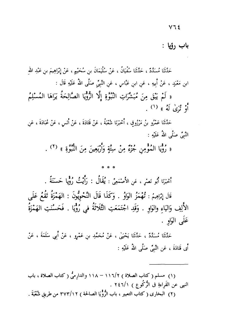 حَدَّثَنَا عَمْرُو بْنُ مَرْزُوقٍ , أَخْبَرَنَا شُعْبَةُ , عَنْ قَتَادَةَ , عَنْ أَنَسٍ , عَنْ عُبَادَةَ , عَنِ النَّبِيِّ صَلَّى اللَّهُ عَلَيْهِ: «§رُؤْيَا الْمُؤْمِنِ جُزْءٌ مِنْ سِتَّةٍ وَأَرْبَعِينَ مِنَ النُّبُوَّةِ» أَخْبَرَنَا أَبُو نَصْرٍ , عَنِ الْأَصْمَعِيِّ , يُقَالُ: رَأَيْتُ رُؤْيَا حَسَنَةً قَالَ إِبْرَاهِيمُ: تُهْمَزُ الْوَاوُ كَذَا قَالَ النَّحْوِيُّونَ: الْهَمْزَةُ تَقَعُ عَلَى الْأَلِفِ وَالْيَاءِ وَالْوَاوِ وَقَدِ اجْتَمَعَتِ الثَّلَاثَةُ فِي رُؤْيَا فَحَسُنَتِ الْهَمْزَةُ عَلَى الْوَاوِ