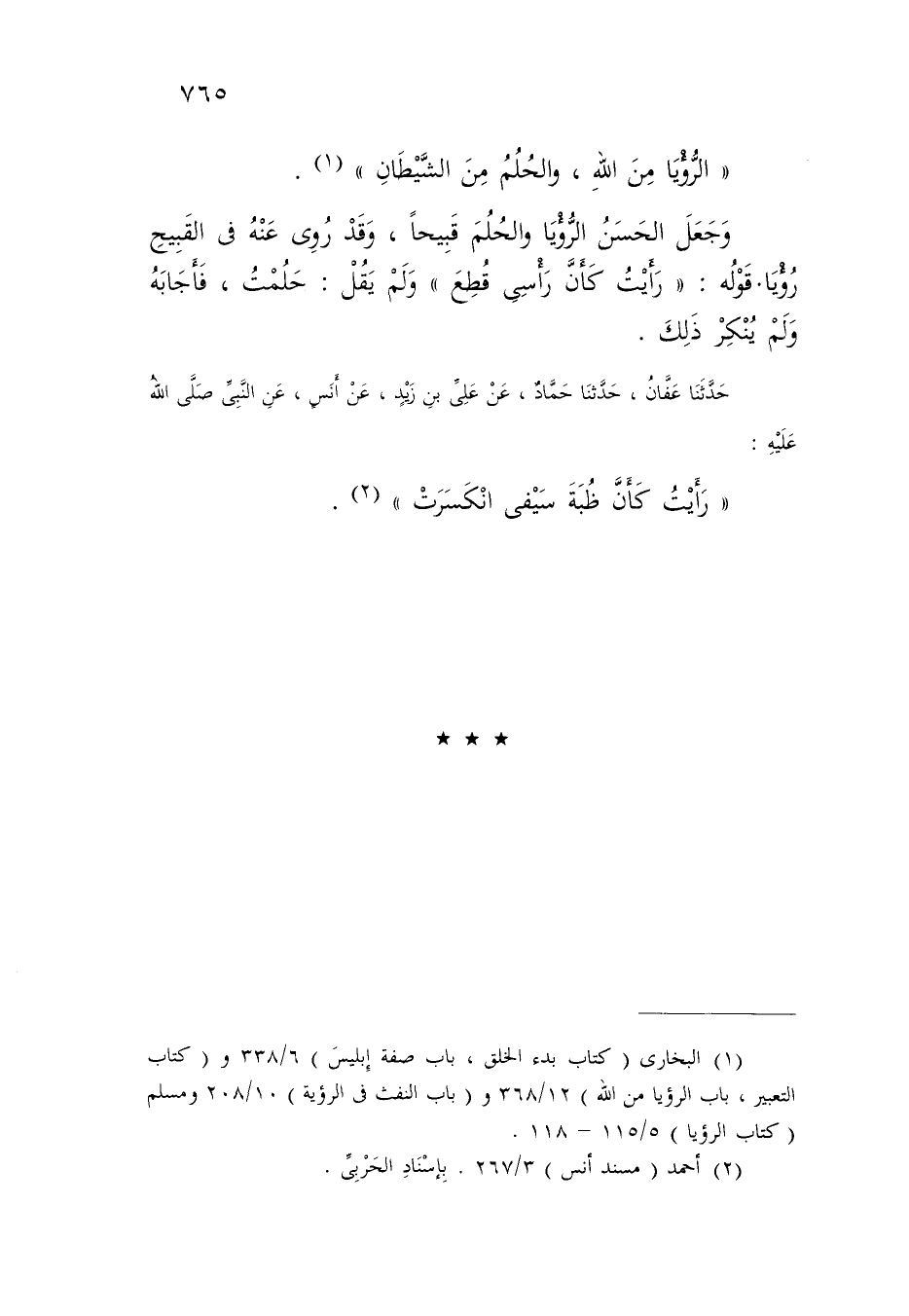حَدَّثَنَا عَفَّانُ , حَدَّثَنَا حَمَّادٌ , عَنْ عَلِيِّ بْنِ زَيْدٍ , عَنْ أَنَسٍ , عَنِ النَّبِيِّ صَلَّى اللَّهُ عَلَيْهِ: «§رَأَيْتُ كَأَنَّ ظُبَةَ سَيْفِيَ انْكَسَرَتْ»