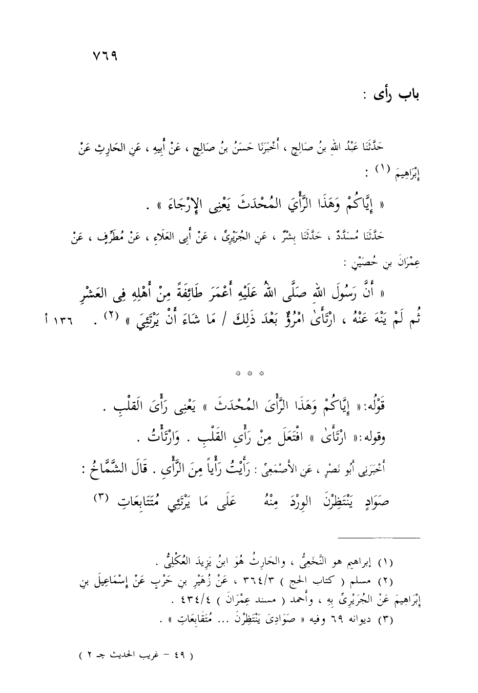 حَدَّثَنَا مُسَدَّدٌ , حَدَّثَنَا بِشْرٌ , عَنِ الْجُوَيْرِيِّ , عَنْ أَبِي الْعَلَاءِ , عَنْ مُطَرِّفٍ , عَنْ عِمْرَانَ بْنِ حُصَيْنٍ: أَنَّ رَسُولَ اللَّهِ صَلَّى اللَّهُ عَلَيْهِ: §أَعْمَرَ طَائِفَةً مِنْ أَهْلِهِ فِي الْعَشْرِ ثُمَّ لَمْ يَنْهَ عَنْهُ , ارْتَأَى امْرُؤٌ بَعْدَ ذَلِكَ مَا شَاءَ أَنْ يَرْتَئِيَ " قَوْلُهُ: «إِيَّاكُمْ وَهَذَا الرَّأْيَ الْمُحْدَثَ» : يَعْنِي رَأْيَ الْقَلْبِ وَقَوْلُهُ: «ارْتَأَى» : افْتَعَلَ مِنْ رَأْيِ الْقَلْبِ وَارْتَأْتُ أَخْبَرَنِي أَبُو نَصْرٍ , عَنِ الْأَصْمَعِيِّ: رَأَيْتُ رَأْيًا مِنَ الرَّأْيِ قَالَ الشَّمَّاخُ: