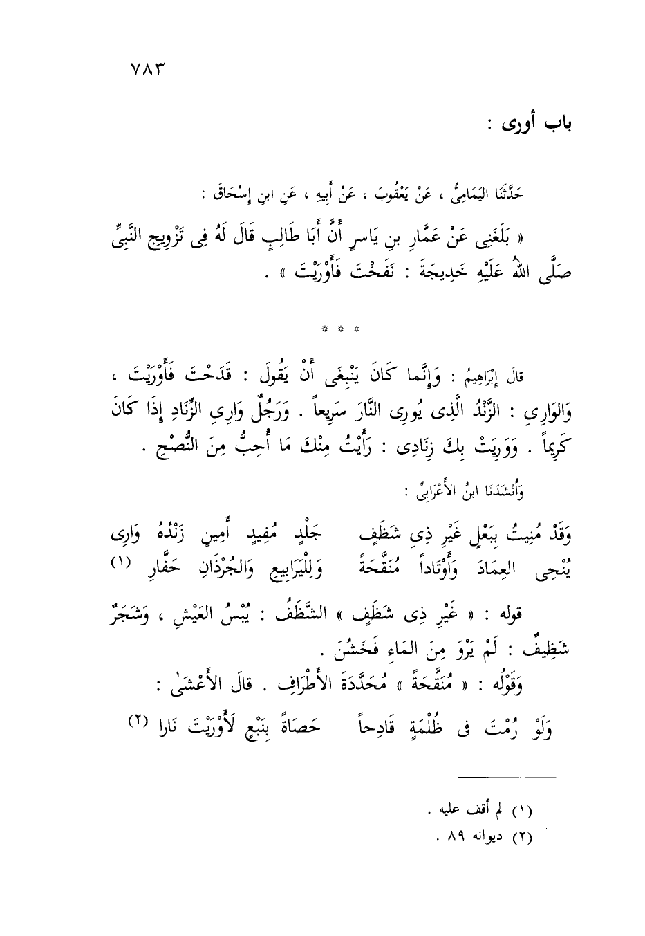 حَدَّثَنَا الْيَمَامِيُّ , عَنْ يَعْقُوبَ , عَنْ أَبِيهِ , عَنِ ابْنِ إِسْحَاقَ: بَلَغَنِي عَنْ عَمَّارِ بْنِ يَاسِرٍ , أَنَّ أَبَا طَالِبٍ , قَالَ لَهُ فِي تَزْوِيجِ النَّبِيِّ صَلَّى اللَّهُ عَلَيْهِ خَدِيجَةَ: «§نَفَخْتَ فَأَوْرَيْتَ» قَالَ إِبْرَاهِيمُ: وَإِنَّمَا كَانَ يَنْبَغِي أَنْ يَقُولَ: قَدَحْتَ فَأَوْرَيْتَ , وَالْوَارِي: الزِّنْدُ الَّذِي يُورِي النَّارَ سَرِيعًا , وَرَجُلٌ وَارِي الزِّنَادِ إِذَا كَانَ كَرِيمًا , وَوَرِيَتْ بِكَ زِنَادِي: رَأَيْتُ مِنْكَ مَا أُحِبُّ مِنَ النُّصْحِ وَأَنْشَدَنَا ابْنُ الْأَعْرَابِيِّ: