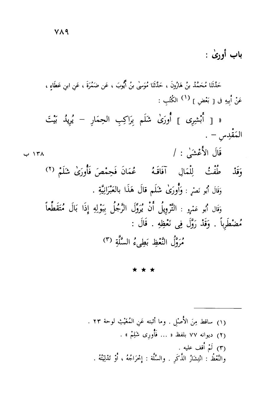 حَدَّثَنَا مُحَمَّدُ بْنُ هَارُونَ , حَدَّثَنَا مُوسَى بْنُ أَيُّوبَ , عَنْ ضَمْرَةَ , عَنِ ابْنِ عَطَاءٍ , عَنْ أَبِيهِ , فِي بَعْضِ الْكُتُبِ: «§أَبْشِرِي أُورَى شَلَمَ بِرَاكِبِ الْحِمَارِ» , يُرِيدُ بَيْتَ الْمَقْدِسِ " قَالَ الْأَعْشَى: