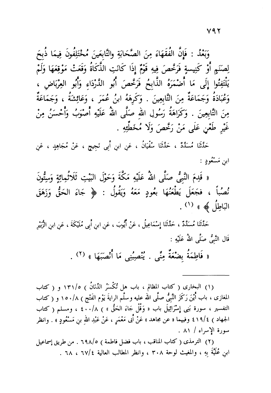 حَدَّثَنَا مُسَدَّدٌ , حَدَّثَنَا سُفْيَانُ , عَنِ ابْنِ أَبِي نَجِيحٍ , عَنْ مُجَاهِدٍ , عَنِ ابْنِ مَسْعُودٍ: قَدِمَ النَّبِيُّ صَلَّى اللَّهُ عَلَيْهِ مَكَّةَ §وَحَوْلَ الْبَيْتِ ثَلَاثُمِائَةٍ وَسِتُّونَ نُصُبًا , فَجَعَلَ يَطْعَنُهَا بِعُودٍ مَعَهُ , وَيَقُولُ: {جَاءَ الْحَقُّ وَزَهَقَ} [الإسراء: 81] الْبَاطِلُ "