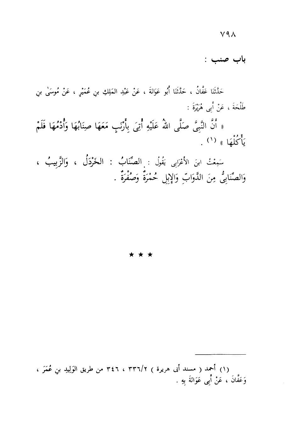 حَدَّثَنَا عَفَّانُ , حَدَّثَنَا أَبُو عَوَانَةَ , عَنْ عَبْدِ الْمَلِكِ بْنِ عُمَيْرٍ , عَنْ مُوسَى بْنِ طَلْحَةَ , عَنْ أَبِي هُرَيْرَةَ: «أَنَّ النَّبِيَّ صَلَّى اللَّهُ عَلَيْهِ §أُتِيَ بِأَرْنَبٍ مَعَهَا صِنَابُهَا وَأُدْمُهَا فَلَمْ يَأْكُلْهَا» سَمِعْتُ ابْنَ الْأَعْرَابِيِّ يَقُولُ: الصِّنَابُ: الْخَرْدَلُ , وَالزَّبِيبُ , وَالصَّنَابِيُّ مِنَ الدَّوَابِّ وَالْإِبِلِ حُمْرَةٌ وَصُفْرَةٌ