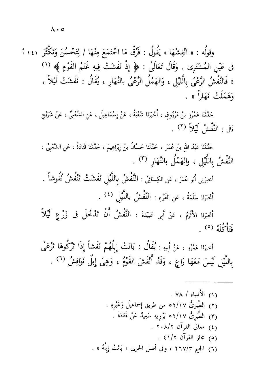 حَدَّثَنَا عَبْدُ اللَّهِ بْنُ عُمَرَ , حَدَّثَنَا حَسَّانُ بْنُ إِبْرَاهِيمَ , حَدَّثَنَا قَتَادَةُ , عَنِ الشَّعْبِيِّ: «§النَّفْشُ بِاللَّيْلِ , وَالْهَمَلُ بِالنَّهَارِ» أَخْبَرَنِي أَبُو عُمَرَ , عَنِ الْكَسَائِيِّ: النَّفْشُ بِاللَّيْلِ , نَفَشَتْ تَنْفُشُ نُفُوشًا أَخْبَرَنَا سَلَمَةُ , عَنِ الْفَرَّاءِ: النَّفْشُ بِاللَّيْلِ أَخْبَرَنَا الْأَثْرَمُ , عَنْ أَبِي عُبَيْدَةَ: النَّفْشُ أَنْ تَدْخُلَ , فِي زَرْعٍ لَيْلًا فَتَأْكُلَهُ أَخْبَرَنَا عَمْرٌو , عَنْ أَبِيهِ , يُقَالُ: بَاتَتْ إِبِلُهُمْ نَفَشًا: إِذَا تَرَكُوهَا تَرْعَى بِاللَّيْلِ لَيْسَ مَعَهَا رَاعٍ , وَقَدْ أَنْفَشَ الْقَوْمُ , وَهِيَ إِبِلٌ نَوَافِشُ -[806]- قَالَ إِبْرَاهِيمُ: النَّوَافِشُ إِبِلٌ تَرَدَّدُ بِاللَّيْلِ فِي الْمَرْعَى بِلَا رَاعٍ كَالْهَوَامِلِ بِالنَّهَارِ