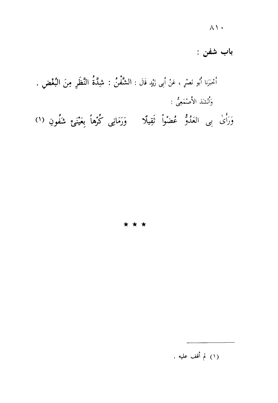 §بَابُ: شفن أَخْبَرَنَا أَبُو نَصْرٍ , عَنْ أَبِي زَيْدٍ , قَالَ: الشَّفْنُ: شِدَّةُ النَّظَرِ مِنَ الْبُغْضِ وَأَنْشَدَ الْأَصْمَعِيُّ: