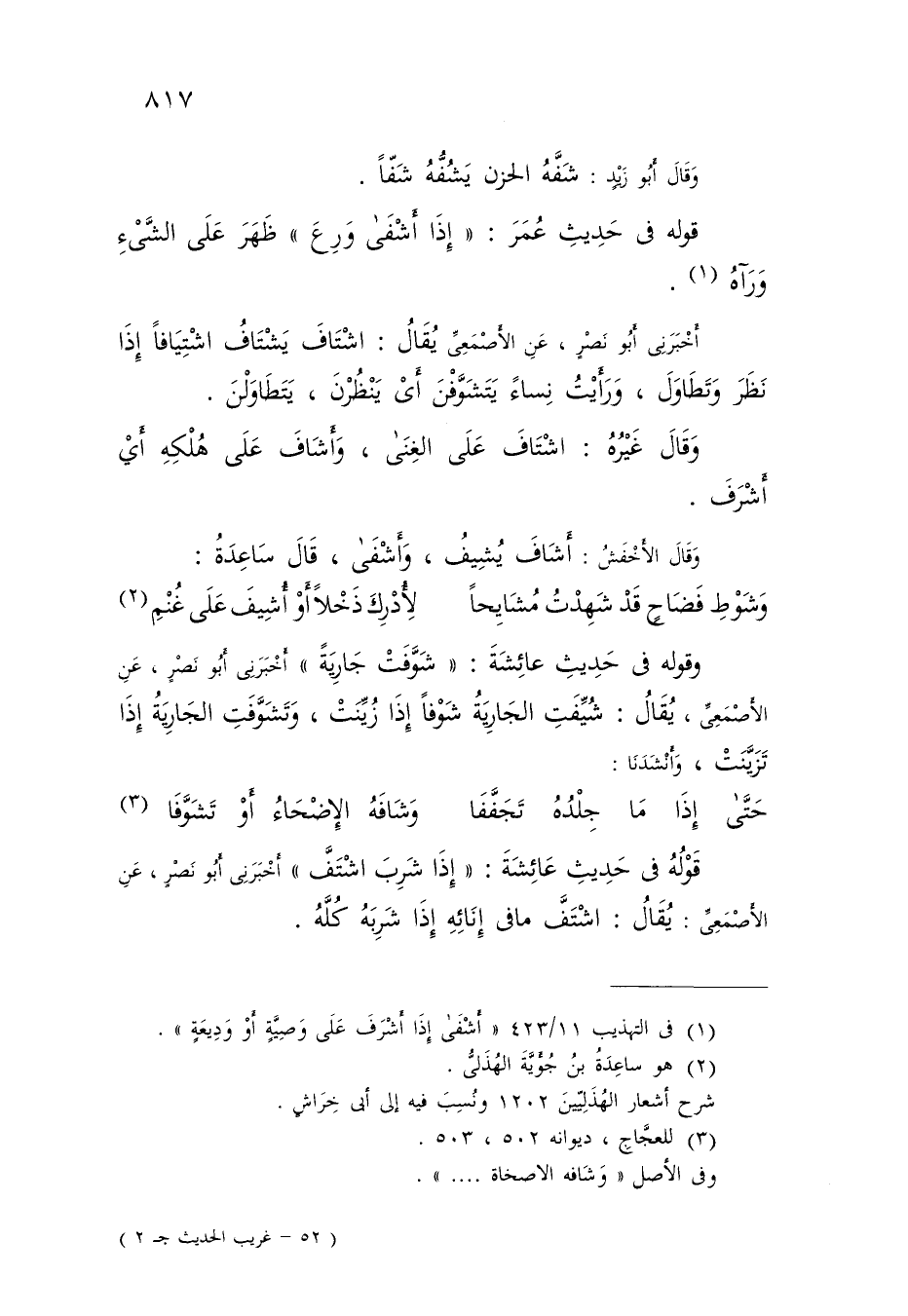 وَقَالَ أَبُو زَيْدٍ: شَفَّهُ الْحُزْنُ يَشُفُّهُ شَفًّا قَوْلُهُ فِي حَدِيثِ عُمَرَ: «إِذَا أَشْفَى وَرِعَ» , ظَهَرَ عَلَى الشَّيْءِ وَرَآهُ , أَخْبَرَنِي أَبُو نَصْرٍ , عَنِ الْأَصْمَعِيِّ , يُقَالُ: اشْتَافَ يَشْتَافُ اشْتِيَافًا: إِذَا نَظَرَ وَتَطَاوَلَ , وَرَأَيْتُ نِسَاءً يَتَشَوَّفْنَ: أَيْ يَنْظُرْنَ يَتَطَاوَلْنَ وَقَالَ غَيْرُهُ: اشْتَافَ عَلَى الْغِنَى , وَأَشَافَ عَلَى هَلَكَةٍ: أَيْ أَشْرَفَ وَقَالَ الْأَخْفَشُ: أَشَافَ يُشِيفُ , وَأَشْفَى , قَالَ سَاعِدَةُ: