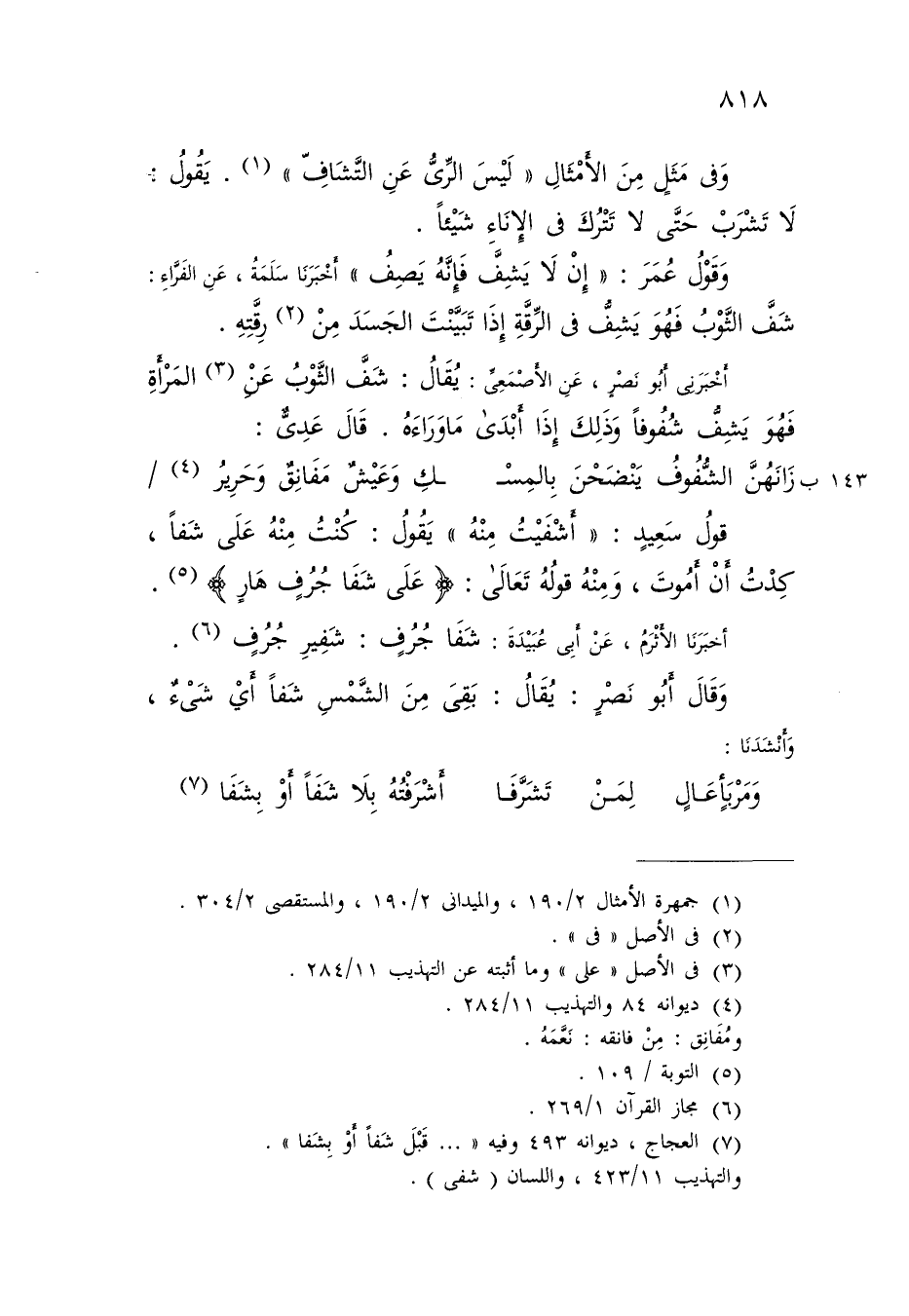 أَخْبَرَنَا الْأَثْرَمُ , عَنْ أَبِي عُبَيْدَةَ: {§شَفَا جُرُفٍ} [التوبة: 109] «شَفِيرِ جُرُفٍ» وَقَالَ أَبُو نَصْرٍ: يُقَالُ: بَقِيَ مِنَ الشَّمْسِ شَفًا: أَيْ شَيْءٌ , وَأَنْشَدَنَا: