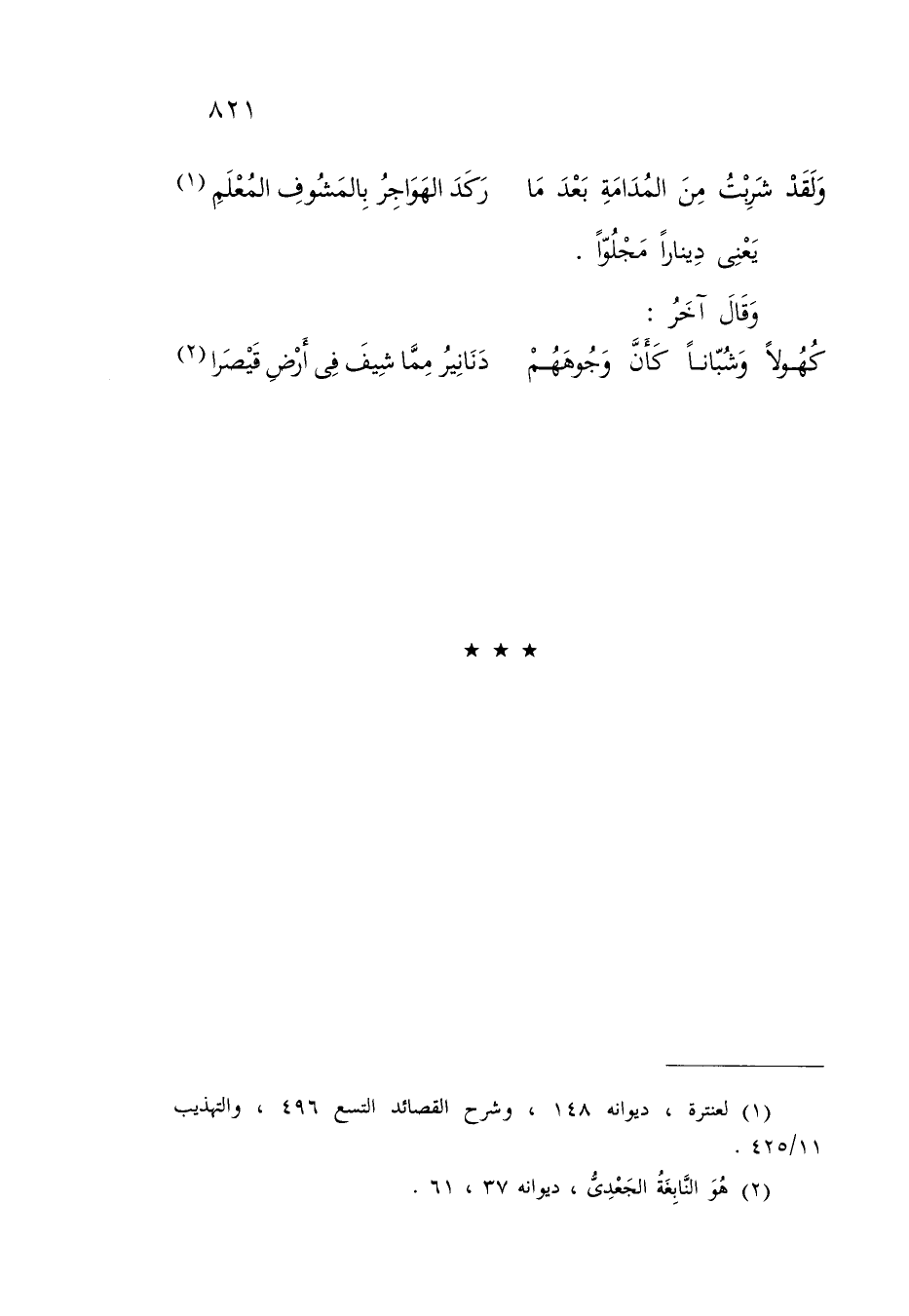 وَلَقَدْ شَرِبْتُ مِنَ الْمُدَامَةِ بَعْدَمَا ... رَكَدَ الْهَوَاجِرُ بِالْمَشُوفِ الْمُعْلَمِ