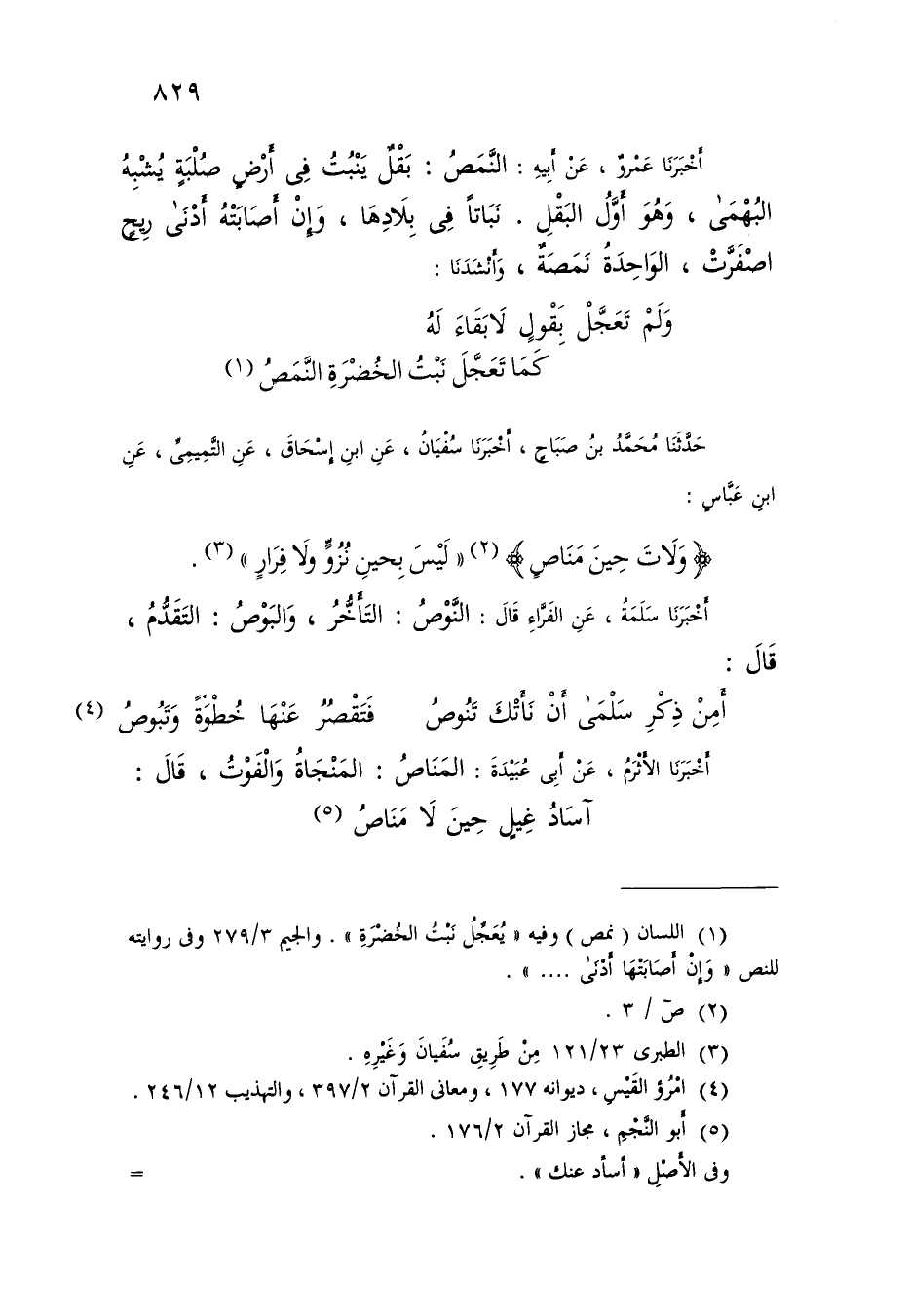 أَخْبَرَنَا مُحَمَّدُ بْنُ صَبَاحٍ , أَخْبَرَنَا سُفْيَانُ , عَنِ أَبِي إِسْحَاقَ , عَنِ التَّمِيمِيِّ , عَنِ ابْنِ عَبَّاسِ: {§وَلَاتَ حينَ مَنَاصٍ} [ص: 3] «لَيْسَ بِحِينِ نُزُوٍّ وَلَا فِرَارٍ» أَخْبَرَنَا سَلَمَةُ , عَنِ الْفَرَّاءِ قَالَ: النَّوْصُ: التَّأَخُّرُ , وَالْبَوْصُ: التَّقَدُّمُ , قَالَ: