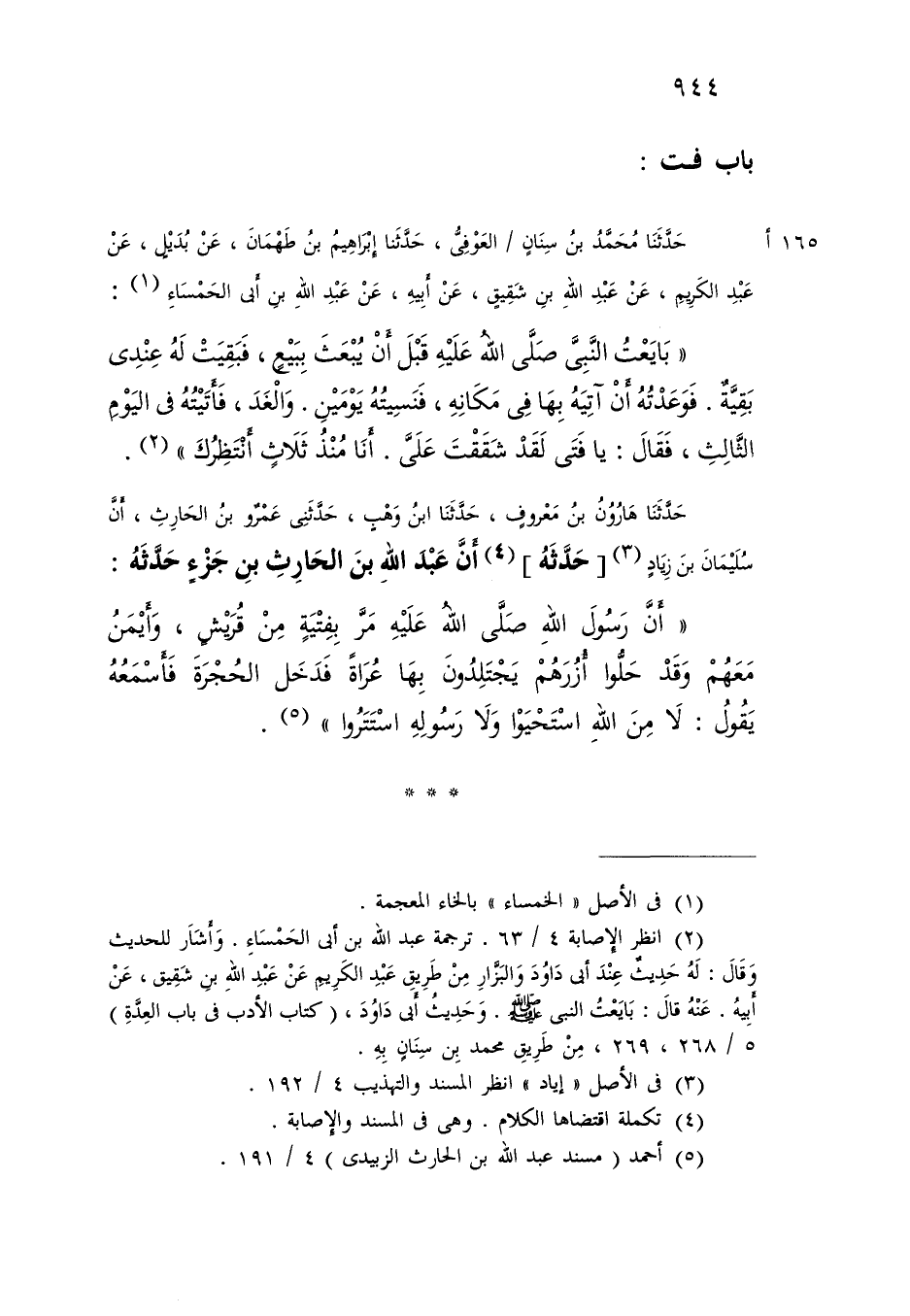 حَدَّثَنَا مُحَمَّدُ بْنُ سِنَانٍ الْعَوَقِيُّ، حَدَّثَنَا إِبْرَاهِيمُ بْنُ طَهْمَانَ، عَنْ بُدَيْلٍ، عَنْ عَبْدِ الْكَرِيمِ بْنِ عَبْدِ اللَّهِ بْنِ شَقِيقٍ، عَنْ أَبِيهِ، عَنْ عَبْدِ اللَّهِ بْنِ أَبِي الْحَمْسَاءِ: " بَايَعْتُ النَّبِيَّ صَلَّى اللَّهُ عَلَيْهِ قَبْلَ أَنْ يُبْعَثَ بِبَيْعٍ، فَبَقِيَتْ لَهُ عِنْدِي بَقِيَّةٌ، فَوَعَدْتُهُ أَنْ آتِيَهُ بِهَا فِي مَكَانِهِ، فَنَسِيتُهُ يَوْمَيْنِ، وَالْغَدَ، فَأَتَيْتُهُ فِي الْيَوْمِ الثَّالِثِ، فَقَالَ: «يَا فَتَى §لَقَدْ شَقَقْتَ عَلَيَّ، أَنَا مُنْذُ ثَلَاثٍ أَنْتَظِرُكَ»