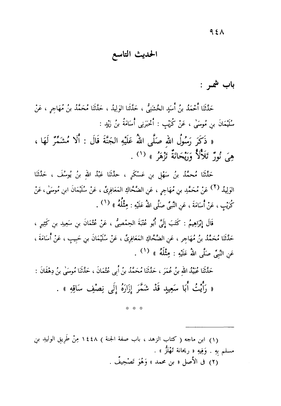 حَدَّثَنَا أَحْمَدُ بْنُ أَسَدٍ الْخُشَنِيُّ، حَدَّثَنَا الْوَلِيدُ، حَدَّثَنَا مُحَمَّدُ بْنُ مُهَاجِرٍ، عَنْ سُلَيْمَانَ بْنِ مُوسَى، عَنْ كُرَيْبٍ، أَخْبَرَنِي أُسَامَةُ بْنُ زَيْدٍ: " ذَكَرَ رَسُولُ اللَّهِ صَلَّى اللَّهُ عَلَيْهِ الْجَنَّةَ، قَالَ: «§أَلَا مُشَمِّرٌ لَهَا، هِيَ نُورٌ تَلَأْلَأَ، وَرَيْحَانَةٌ تَزْهَرُ» حَدَّثَنَا مُحَمَّدُ بْنُ سَهْلِ بْنِ عَسْكَرٍ، حَدَّثَنَا عَبْدُ اللَّهِ بْنُ يُوسُفَ، حَدَّثَنَا الْوَلِيدُ، عَنْ مُحَمَّدِ بْنِ مُهَاجِرٍ، عَنِ الضَّحَّاكِ الْمَعَافِرِيِّ، عَنْ سُلَيْمَانَ بْنِ مُوسَى، عَنْ كُرَيْبٍ، عَنْ أُسَامَةَ، عَنِ النَّبِيِّ صَلَّى اللَّهُ عَلَيْهِ مِثْلَهُ قَالَ إِبْرَاهِيمُ: " كَتَبَ إِلَيَّ أَبُو عُتْبَةَ الْحِمْصِيُّ، عَنْ عُثْمَانَ بْنِ سَعِيدِ بْنِ كَثِيرٍ، حَدَّثَنَا مُحَمَّدُ بْنُ مُهَاجِرٍ، عَنِ الضَّحَّاكِ الْمَعَافِرِيِّ، عَنْ سُلَيْمَانَ بْنِ حَبِيبٍ، عَنْ أُسَامَةَ، عَنِ النَّبِيِّ صَلَّى اللَّهُ عَلَيْهِ مِثْلَهُ