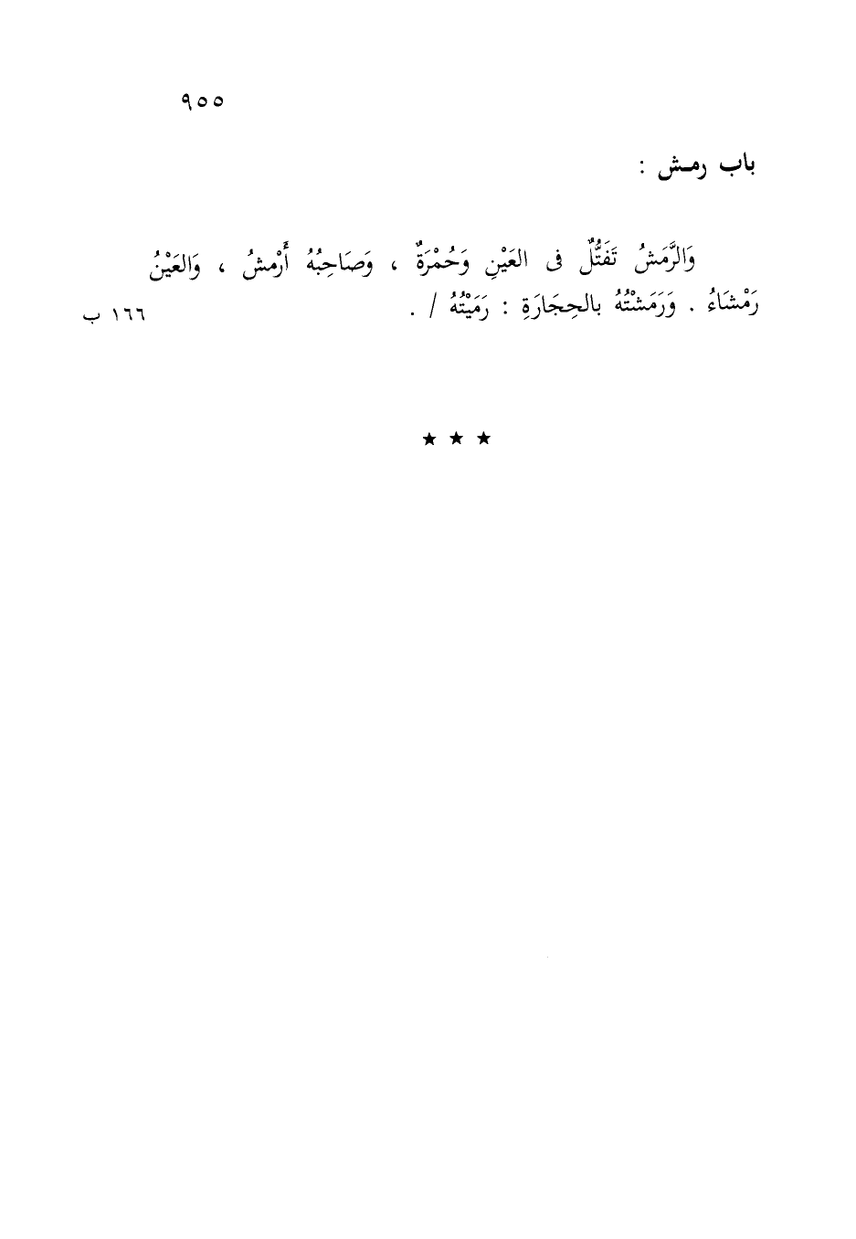 §بَابُ: رمش وَالرَّمَشُ: تَفَتُّلٌ فِي الْعَيْنِ وَحُمْرَةٌ، وَصَاحِبُهُ أَرْمَشُ، وَالْعَيْنُ رَمْشَاءُ، وَرَمَشْتُهُ بِالْحِجَارَةِ: رَمَيْتُهُ