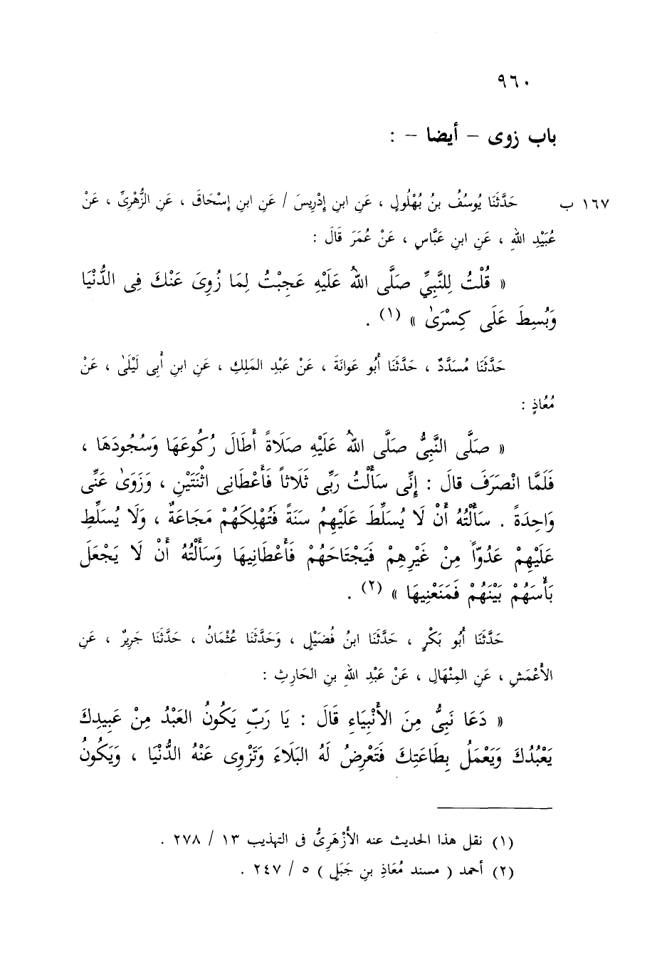 حَدَّثَنَا مُسَدَّدٌ، حَدَّثَنَا أَبُو عَوَانَةَ، عَنْ عَبْدِ الْمَلِكِ، عَنِ ابْنِ أَبِي لَيْلَى، عَنْ مُعَاذٍ: " صَلَّى النَّبِيُّ صَلَّى اللَّهُ عَلَيْهِ صَلَاةً أَطَالَ رُكُوعَهَا، وَسُجُودَهَا، فَلَمَّا انْصَرَفَ، قَالَ: «إِنِّي §سَأَلْتُ رَبِّي ثَلَاثًا، فَأَعْطَانِي اثْنَتَيْنِ، وَزَوَى عَنِّي وَاحِدَةً، سَأَلْتُهُ أَنْ لَا يُسَلِّطَ عَلَيْهِمْ سَنَةً، فَتُهْلِكُهُمْ مَجَاعَةٌ، وَلَا يُسَلِّطَ عَلَيْهِمْ عَدُوًّا مِنْ غَيْرِهِمْ فَيَجْتَاحُهُمْ، فَأَعْطَانِيهَا وَسَأَلْتُهُ أَنْ لَا يَجْعَلَ بَأْسَهُمْ بَيْنَهُمْ، فَمَنَعَنِيهَا»