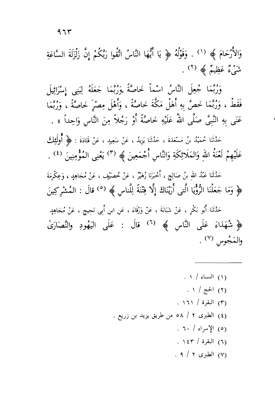 : 1] ، وَقَوْلِهِ: {يَا أَيُّهَا النَّاسُ اتَّقُوا رَبَّكُمْ إِنَّ زَلْزَلَةَ السَّاعَةِ شَيْءٌ عَظِيمٌ} [الحج: 1] وَرُبَّمَا جَعَلَ النَّاسَ اسْمًا خَاصًّا، وَرُبَّمَا جَعَلَهُ لِبَنِي إِسْرَائِيلَ فَقَطْ، وَرُبَّمَا خَصَّ بِهِ أَهْلَ مَكَّةَ خَاصَّةً، وَأَهْلَ مِصْرَ خَاصَّةً، وَرُبَّمَا عَنَى بِهِ النَّبِيَّ صَلَّى اللَّهُ عَلَيْهِ خَاصَّةً، أَوْ رَجُلًا مِنَ النَّاسِ وَاحِدًا