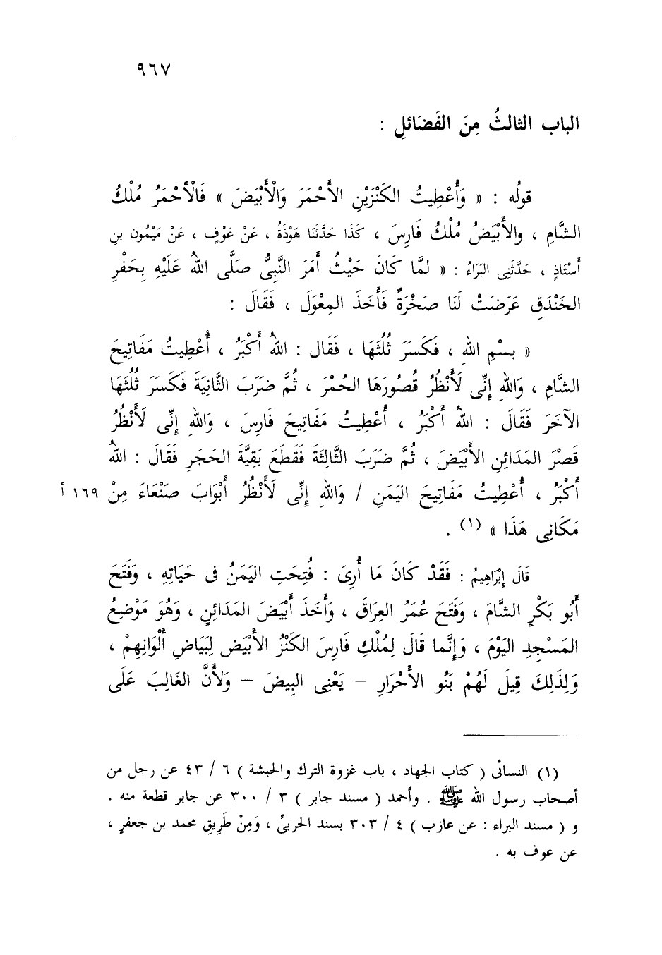 §الْبَابُ الثَّالِثُ مِنَ الْفَضَائِلِ قَوْلُهُ: «وَأُعْطِيتُ الْكَنْزَيْنِ الْأَحْمَرَ وَالْأَبْيَضَ» ، فَالْأَحْمَرُ مُلْكُ الشَّامِ، وَالْأَبْيَضُ مُلْكُ فَارِسَ،