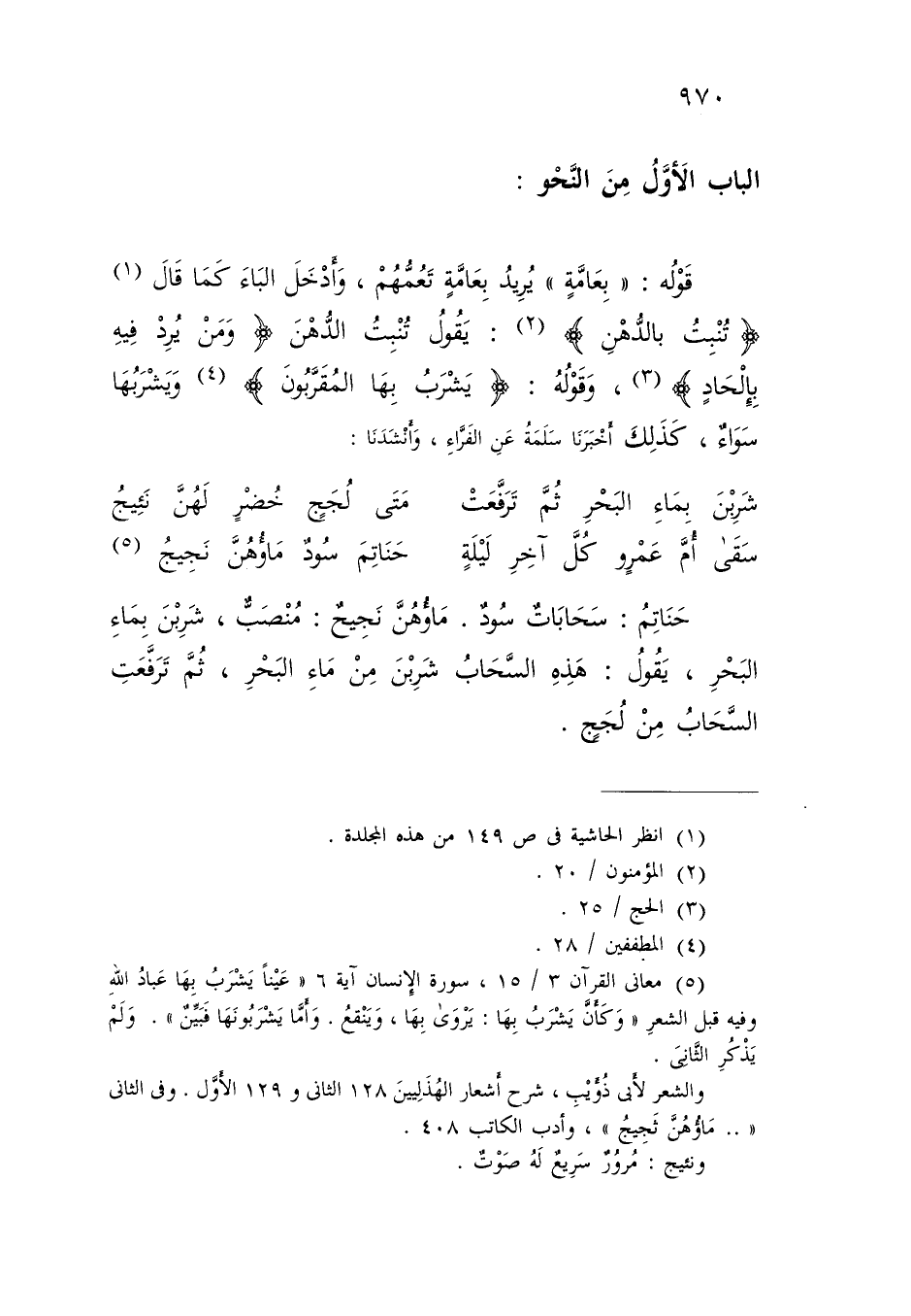 §الْبَابُ الْأَوَّلُ مِنَ النَّحْوِ قَوْلُهُ: «بِعَامَّةٍ» يُرِيدُ بِعَامَّةٍ تَعُمُّهُمْ، وَأَدْخَلَ الْبَاءَ كَمَا قَالَ: {تَنْبُتُ بِالدُّهْنِ} [المؤمنون: 20] : يَقُولُ: تُنْبِتُ الدُّهْنَ: {وَمَنْ يُرِدْ فِيهِ بِإِلْحَادٍ} [الحج: 25] ، وَقَوْلِهِ: {يَشْرَبُ بِهَا الْمُقَرَّبُونَ} [المطففين: 28] ، وَيَشْرَبُهَا سَوَاءٌ كَذَلِكَ أَخْبَرَنَا سَلَمَةُ عَنِ الْفَرَّاءِ، وَأَنْشَدَنَا:
